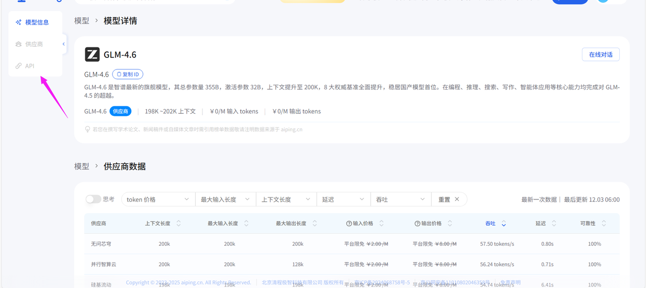 下面我们以GLM-4.6模型为例接入它的API进行测试: