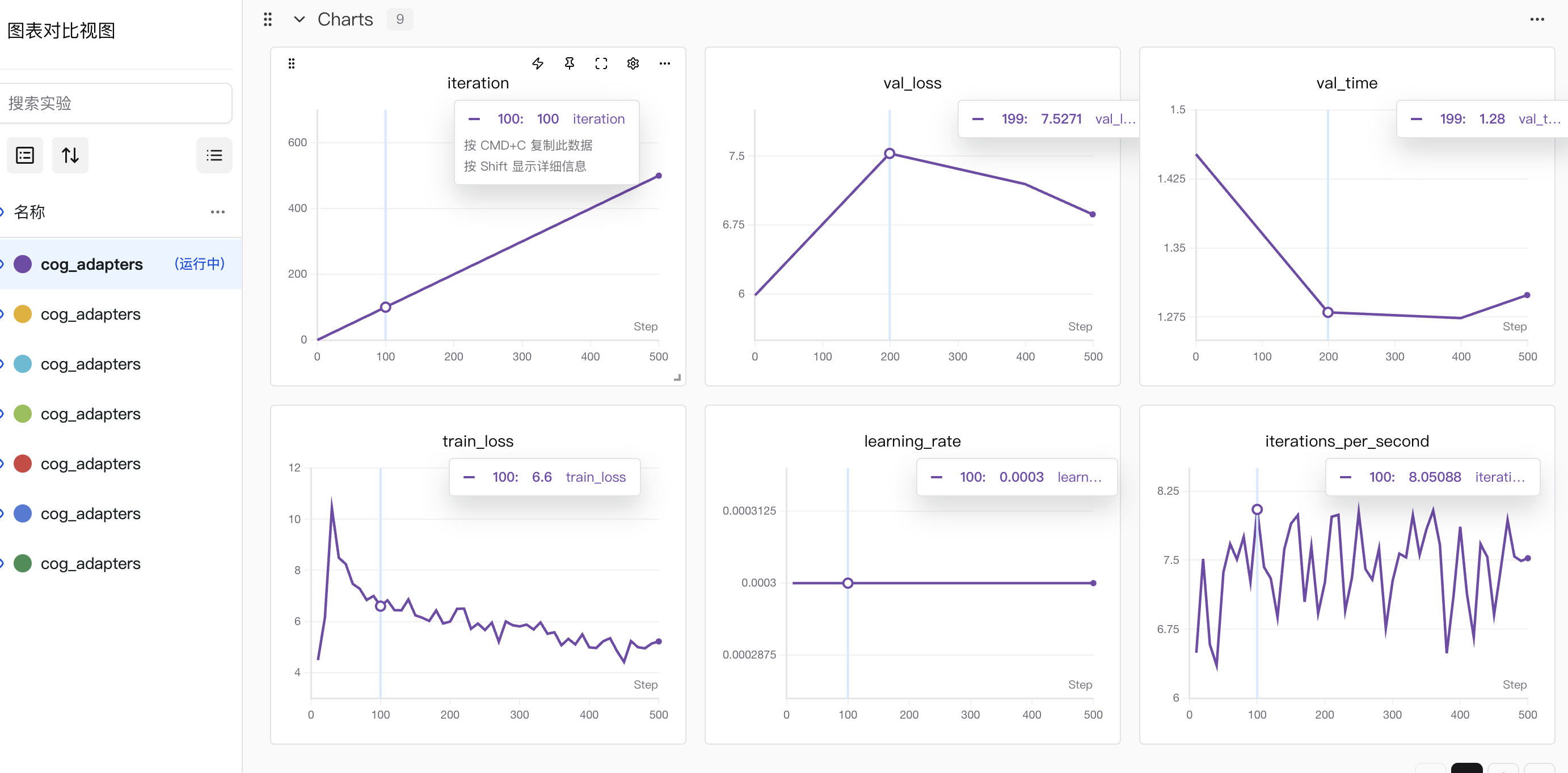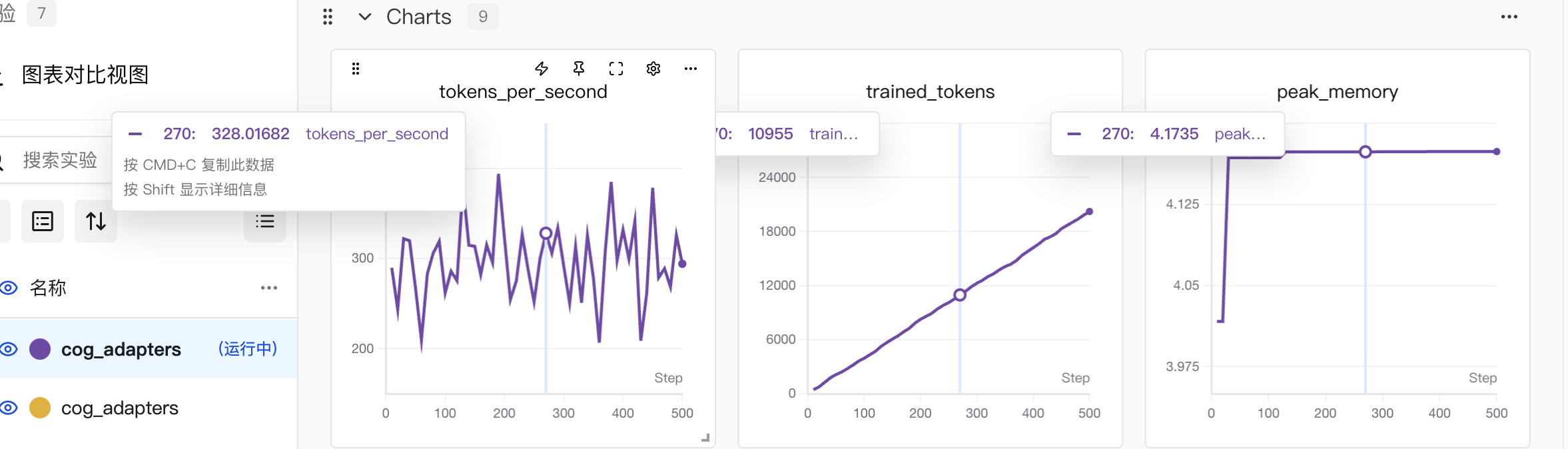 iteration:训练迭代步数(随训练推进持续增加,当前到 500 步左右)val_loss(验证损失):模型在验证集上的误差(越低越好)train_loss(训练损失):模型在训练集上的误差(越低越好)learning_rate(学习率):训练中参数更新的步长(这里保持 0.0003 稳定)val_time(验证耗时):每次验证的时间成本iterations_per_second(每秒迭代数):训练速度(数值越高,训练越快)tokens_per_second(每秒处理 token 数) :模型训练时的数据处理速度(数值越高,训练效率越高)。trained_tokens(已训练 token 总数):训练过程中累计处理的 token 量(随训练步数增加而增长,是训练 "工作量" 的体现)。peak_memory(峰值内存) :训练过程中 GPU/CPU 的最大内存占用(反映资源消耗情况)。
