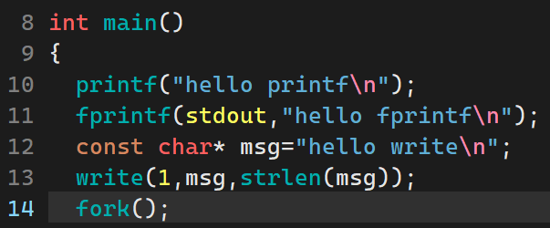 很显然我们分析一下,前面输出给stdout是行刷新,因此我们每输出一行就对内核刷新,内核也是一行就对文件输出。因此fork之后,缓冲区已经没有内容了。