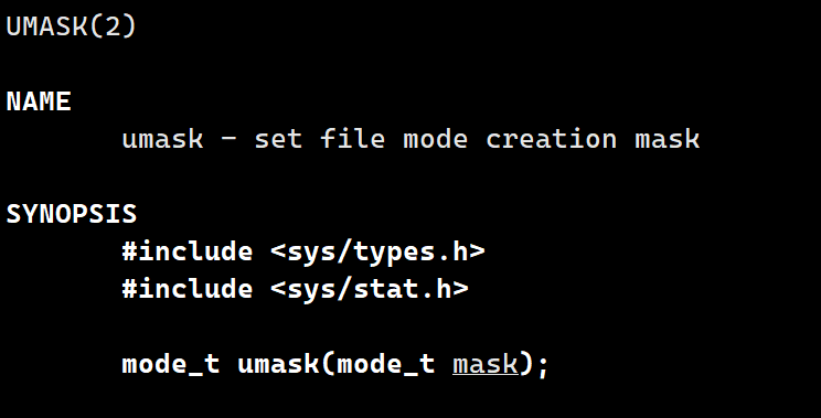 当然我们的open还有第三个参数mode,这个是当文件是新创建时才需传入。传入的是八进制的权限表示。当然也会收到权限掩码的干预,我们也可以调用c语言库函数设置该进程的掩码: