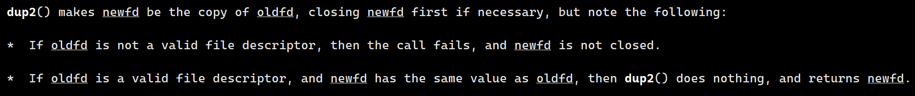所以说我们的输出重定向本质就是将原本要输出给stdout的数据转而输出给其他文件。我们系统调用中也有可以实现输出重定向的接口dup2: