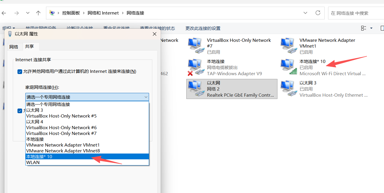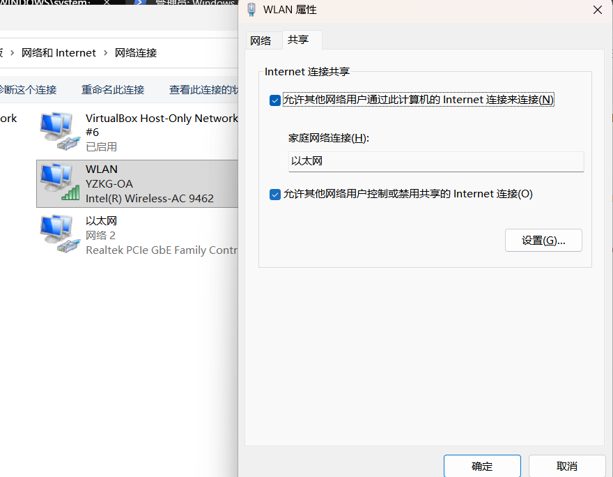选择共享的网卡(这里我使用的无线电网卡),然后选择共享的对象(有线)
