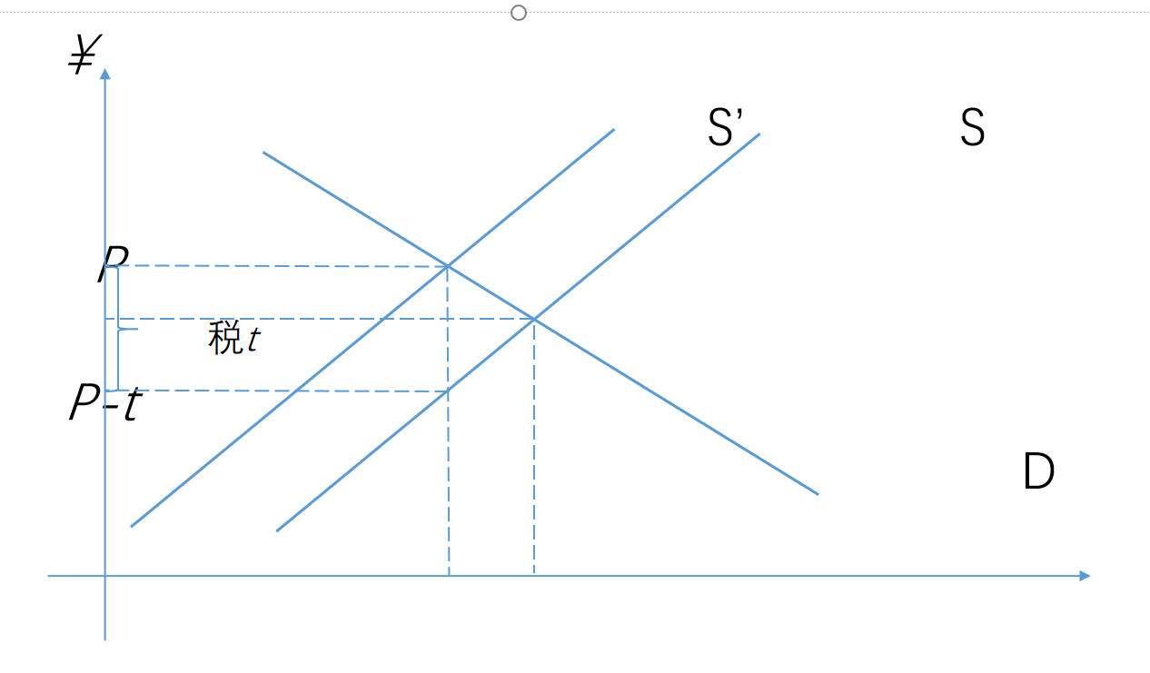 - 在图形上这种变化就体现为整条供给曲线 S 向上垂直平移了 t 的距离,得到了新的供给曲线 S'。