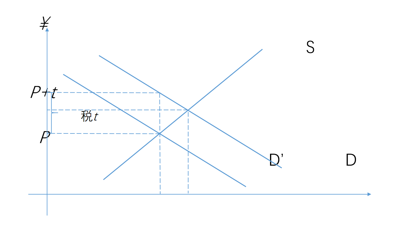 - 在图形上,这种变化,就体现为整条需求曲线 D,向下垂直平移了 t 的距离,得到了新的需求曲线 D'。