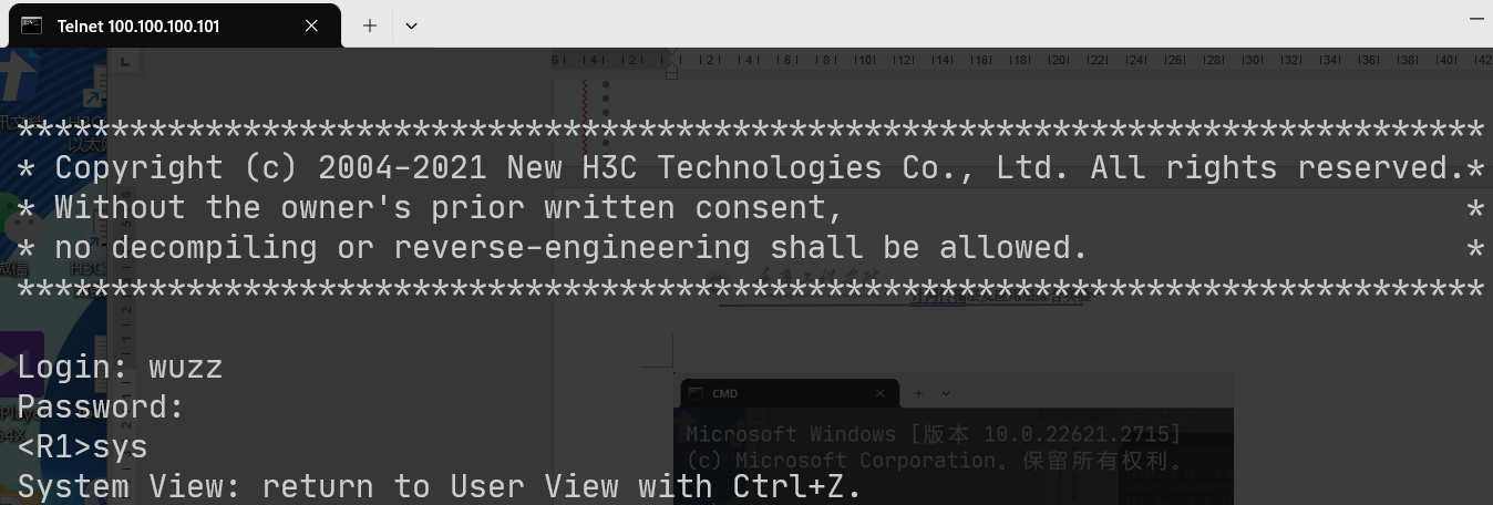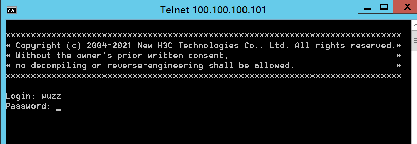 | [R1]telnet server enable [R1]line vty 0 4 [R1-line-vty0-4]authentication-mode scheme [R1-line-vty0-4]local-user wuzz [R1-luser-manage-wuzz]password simple pass12345678 [R1-luser-manage-wuzz]authorization-attribute user-role level-15 [R1-luser-manage-wuzz]service-type telnet |