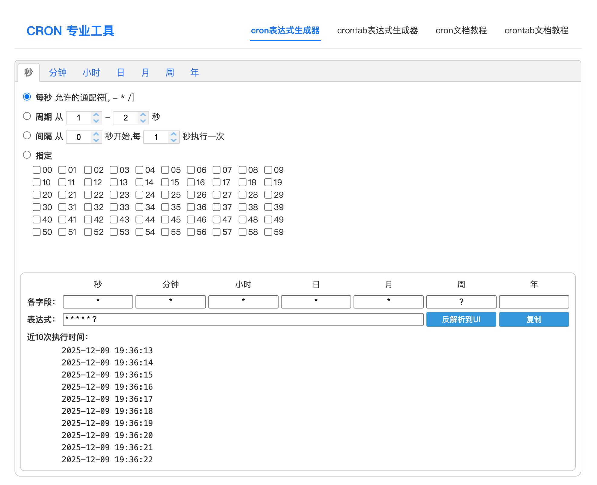 在日常工作中,很多自动化任务、定时脚本、数据备份和系统维护都离不开 cron 表达式。Cron 表达式虽然功能强大,但语法复杂、容易出错:一分钟、小时、日期、星期、月甚至秒级调度,各种 *、/、,、-、L、W、# 等特殊字符让新手很容易迷失方向。为了降低错误风险,提高效率,我们推荐使用**CRON专业工具** ------ 一个简单、直观、可视化的 cron 表达式工具。