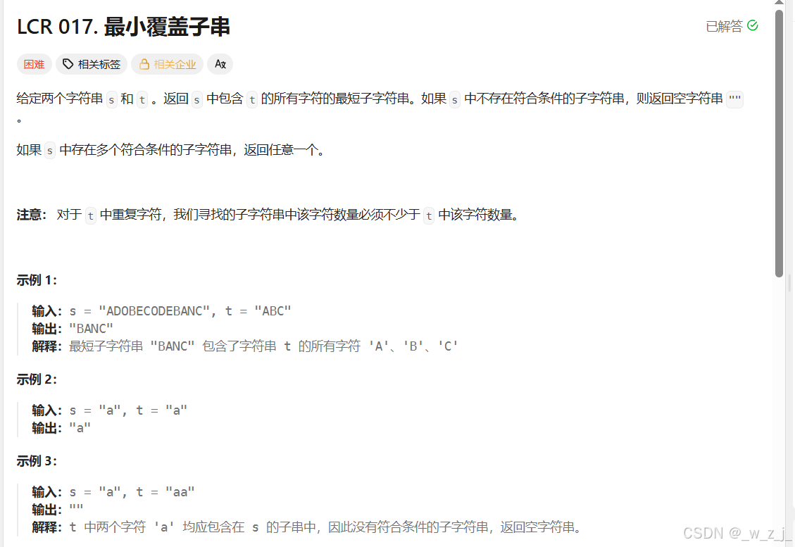 要使整体时间复杂度达到 O(N) ,必须采用滑动窗口的"增量统计"方式。核心思想是维护一个 count,表示当前窗口中还缺多少个字符才能完全覆盖字符串 t。