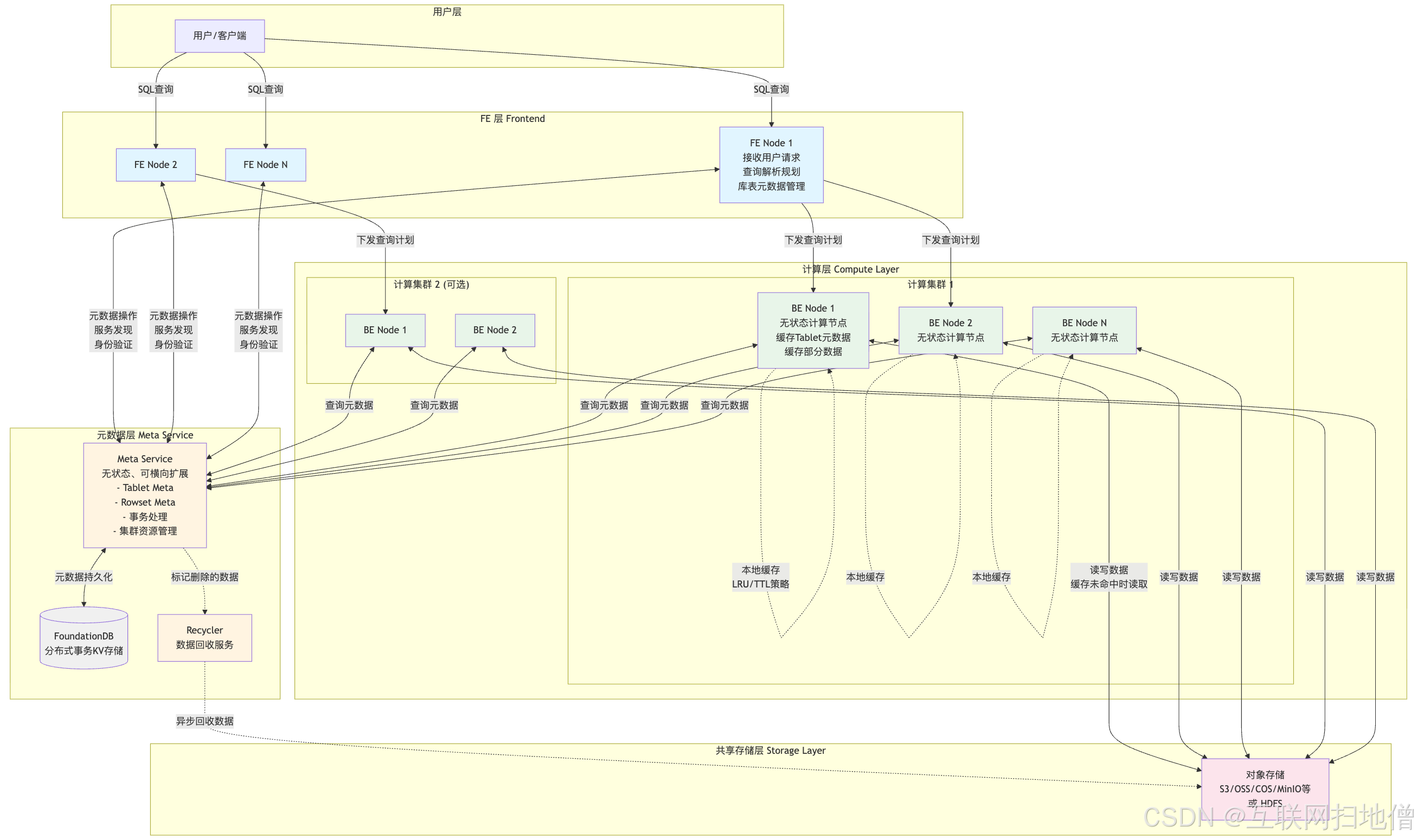 存算分离 则像现代化的图书馆系统,有一个巨大的中央仓库(共享存储)存放所有书籍,而各个分馆(计算集群)只保留热门书籍的副本。读者需要某本书时,如果分馆有就直接借阅(缓存命中),没有则从中央仓库调取(从对象存储读取)。这样每个分馆可以根据客流量灵活调整大小,而不必担心书库容量。下图存算分离模式架构图。