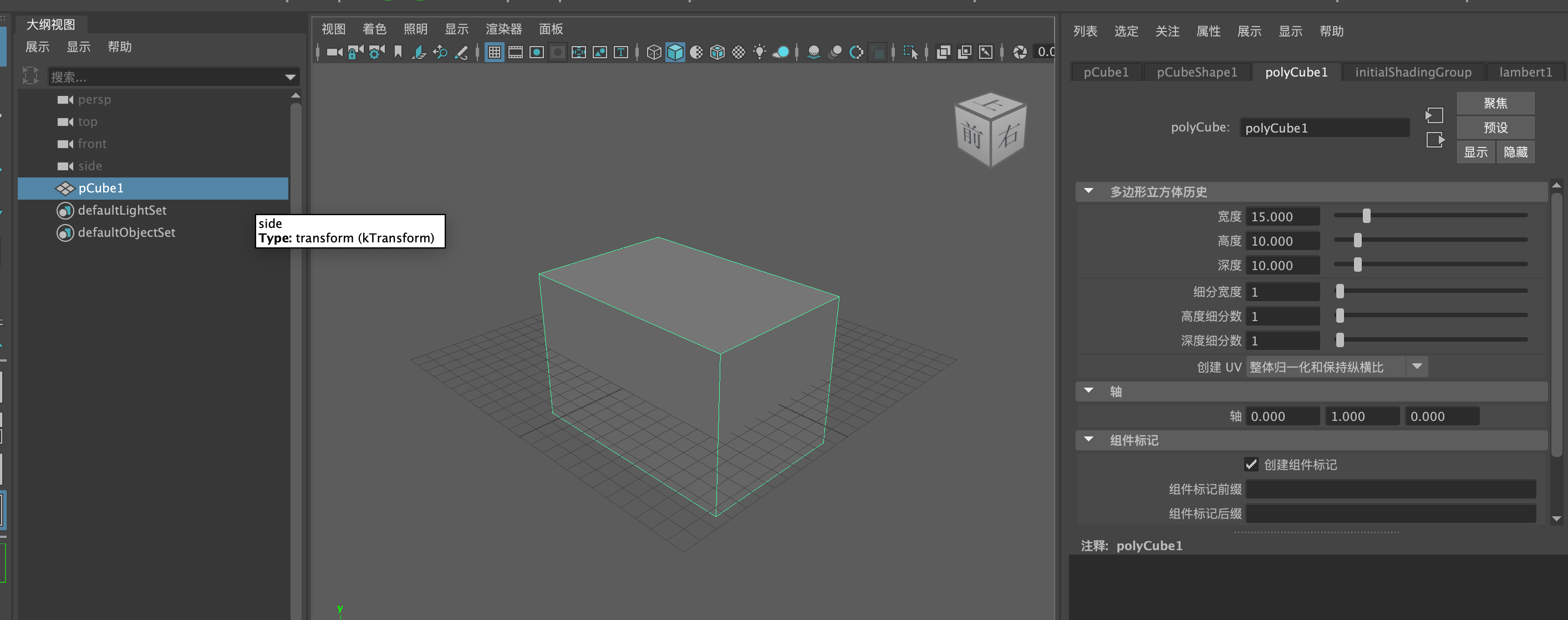 (1)启动中文版Maya 2024软件,单击"多边形建模"工具架上的"多边形立方体"图标,在场景中创建一个长方体模型。(2)在"多边形立方体历史"卷展栏中,设置"宽度"为15,"高度"为10,"深度"为10