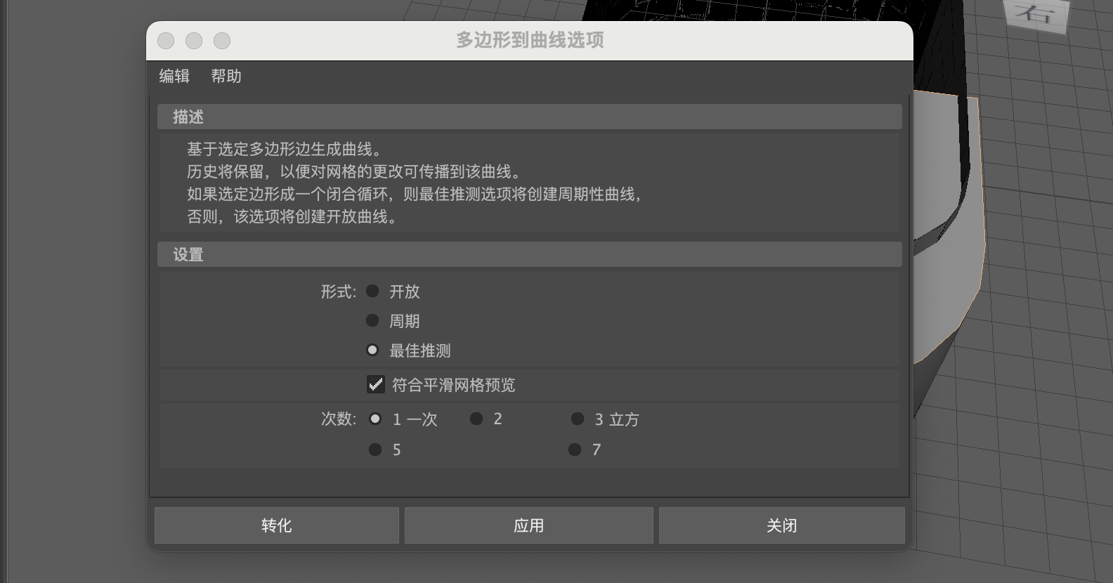 (18)在弹出的"多边形到曲线选项"对话框中,设置"次数"为"1一次",单击"转化"按钮