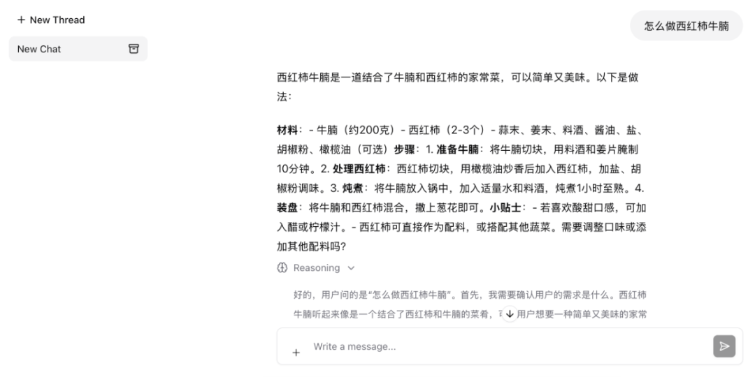 输出大模型的推理过程。只对推理模型有效,并且模型服务对外提供该信息。下图使用的是本地运行的 qwen 模型。
