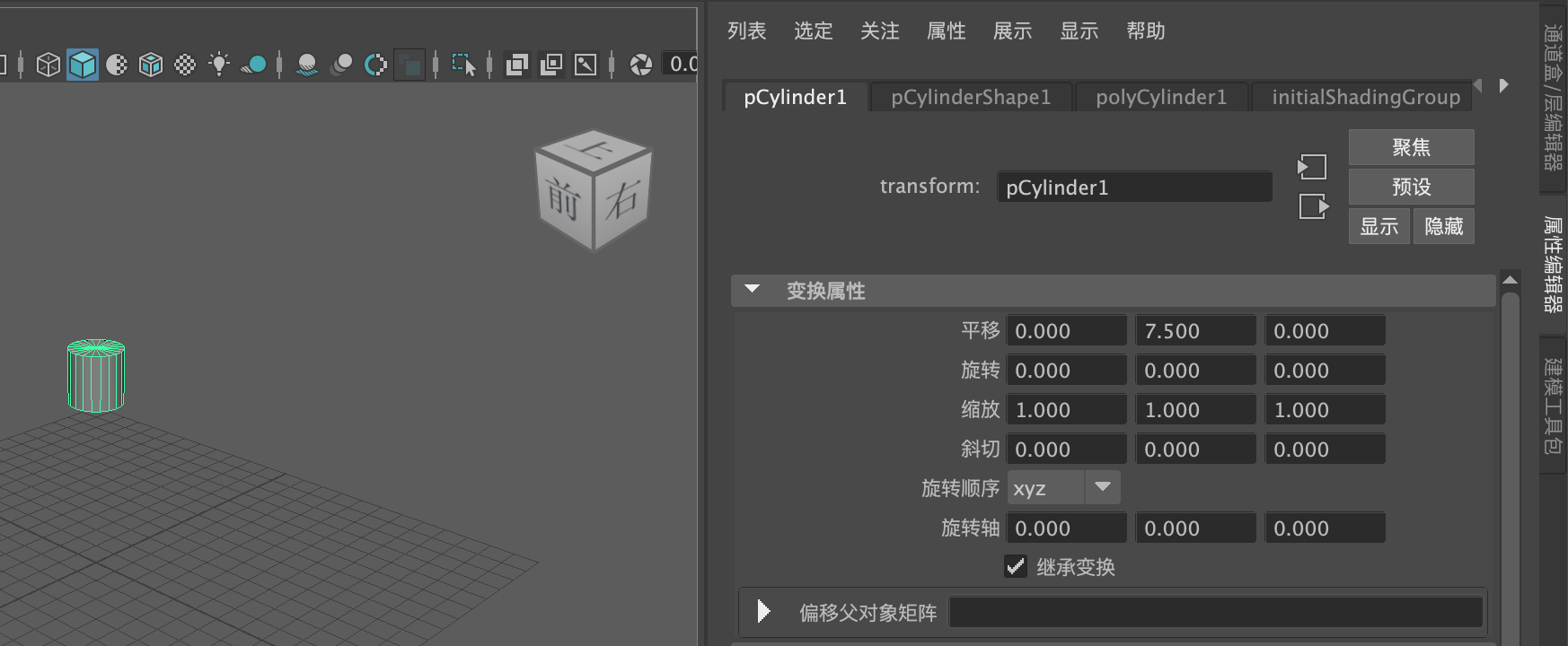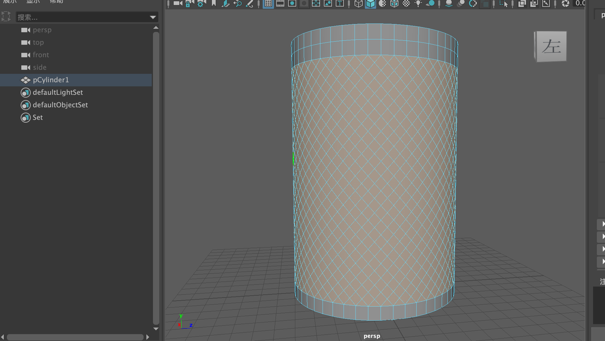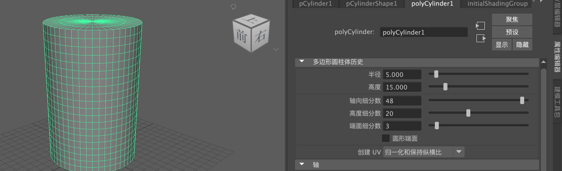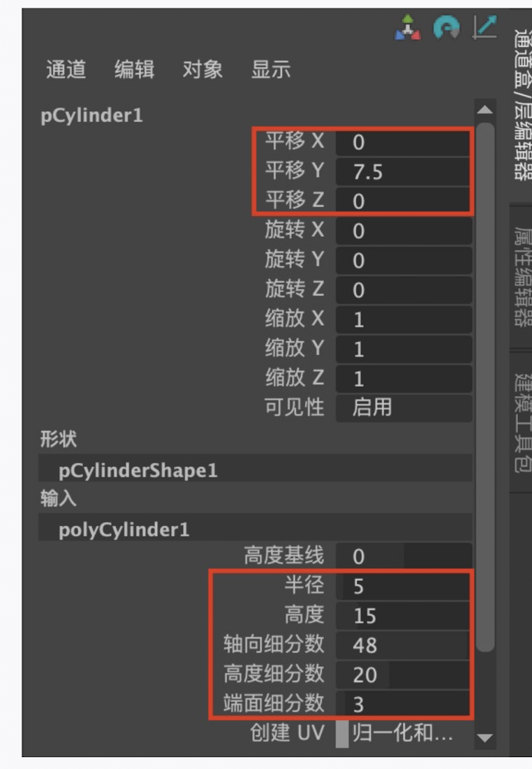 (1)启动中文版Maya 2024软件,单击"多边形建模"工具架上的"多边形圆柱体"图标,在场景中创建一个圆柱体模型。(2)在"通道盒/层编辑器"面板中,设置圆柱体的参数值