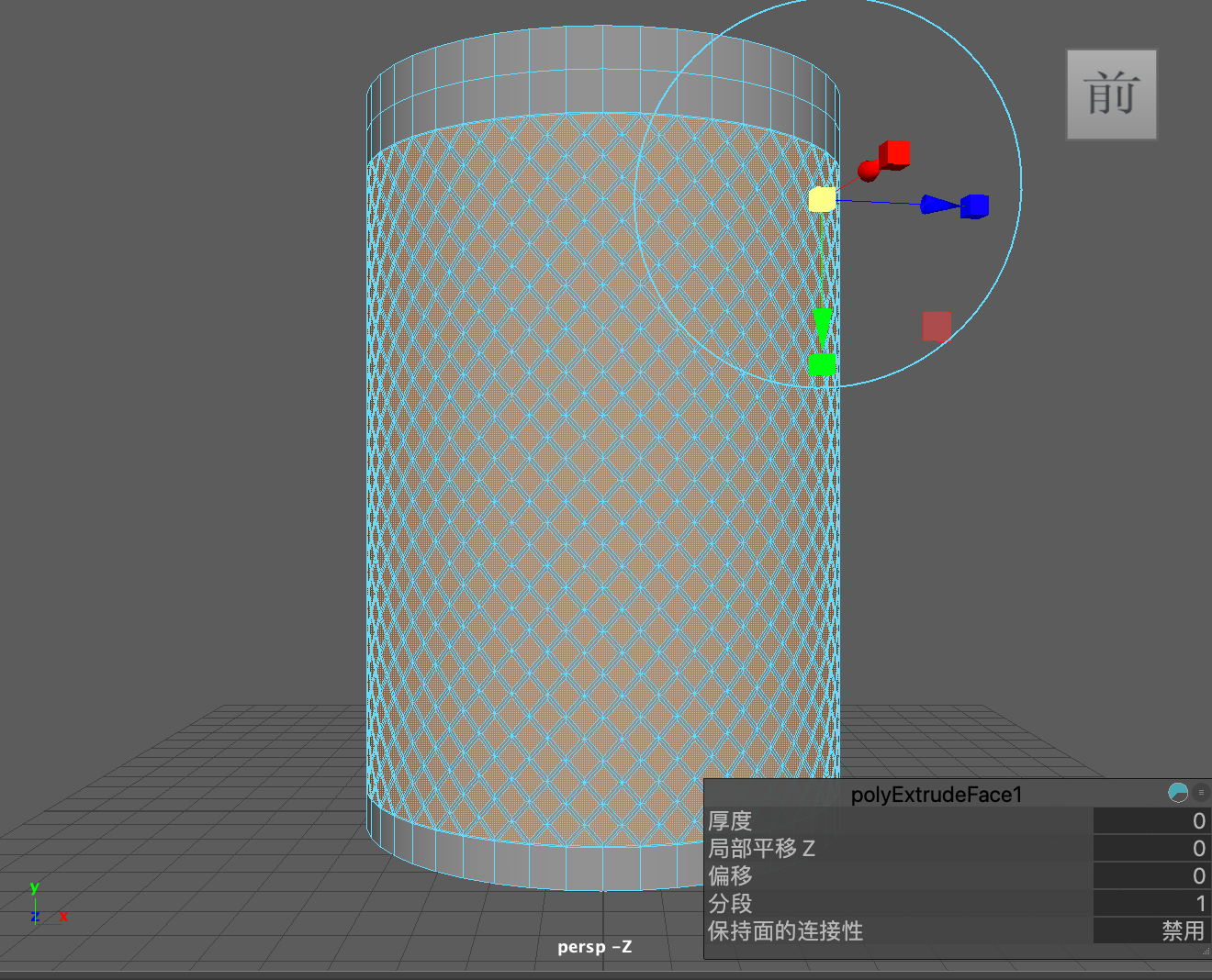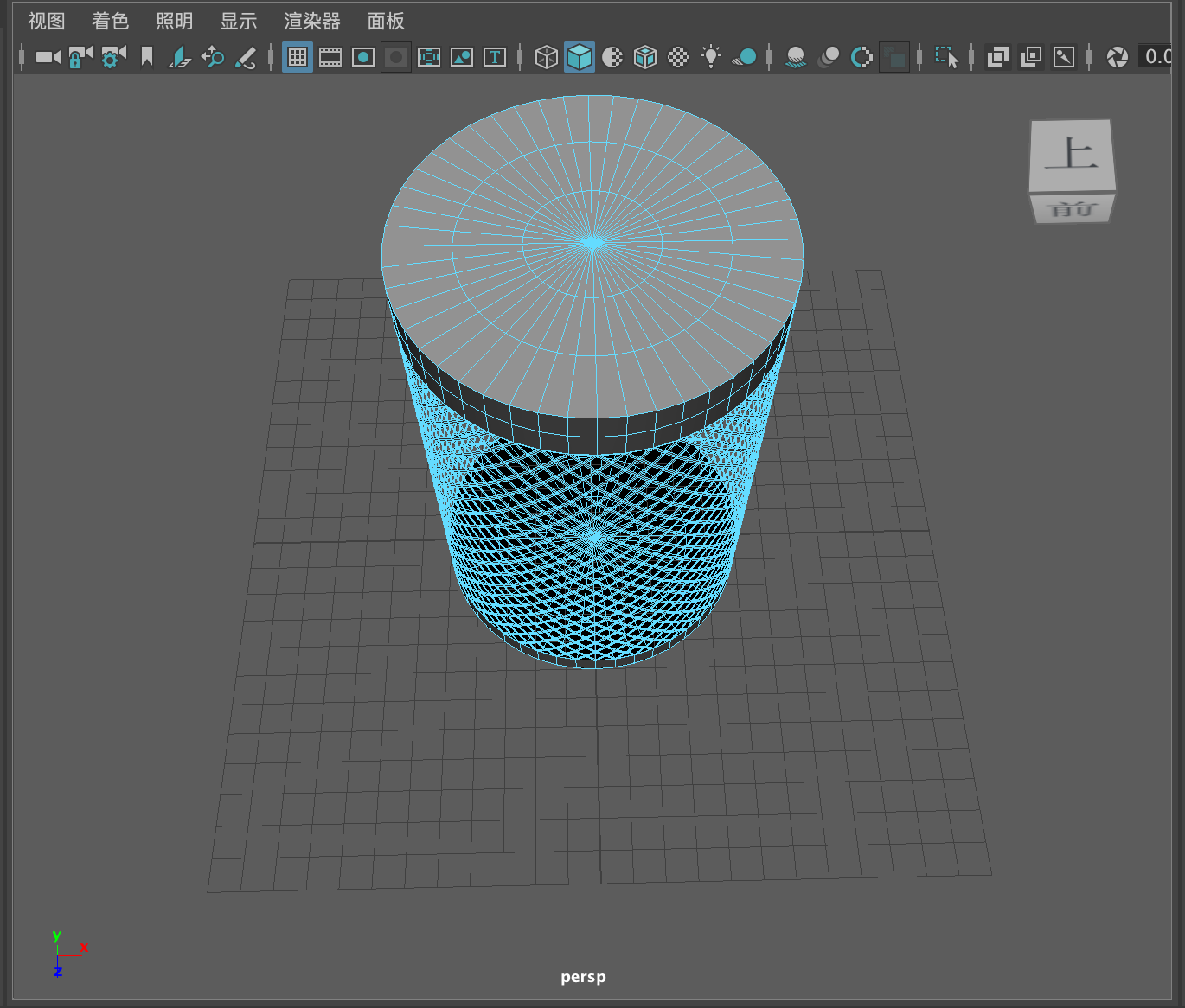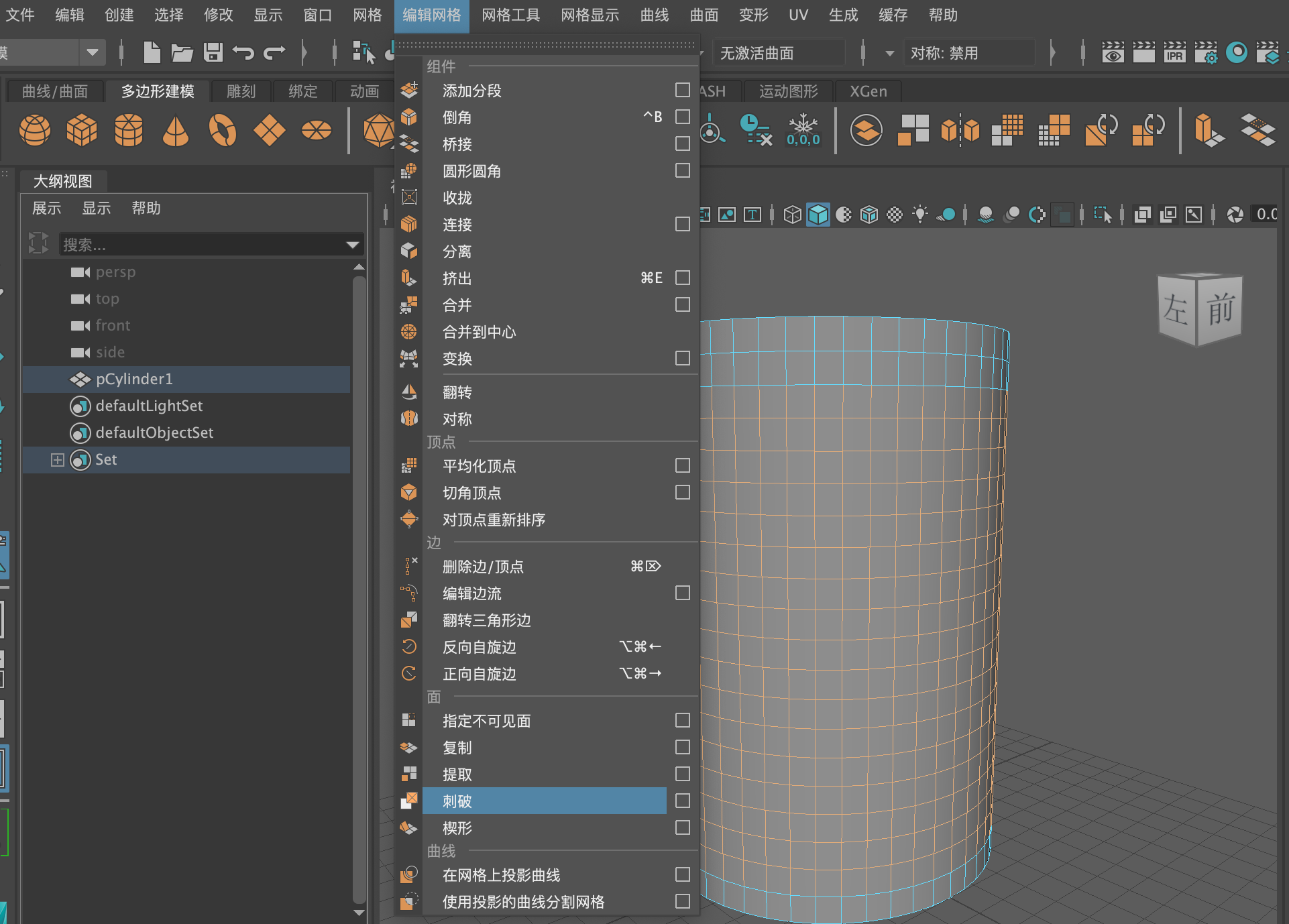 (1)启动中文版Maya 2024软件,单击"多边形建模"工具架上的"多边形圆柱体"图标,在场景中创建一个圆柱体模型。(2)在"通道盒/层编辑器"面板中,设置圆柱体的参数值