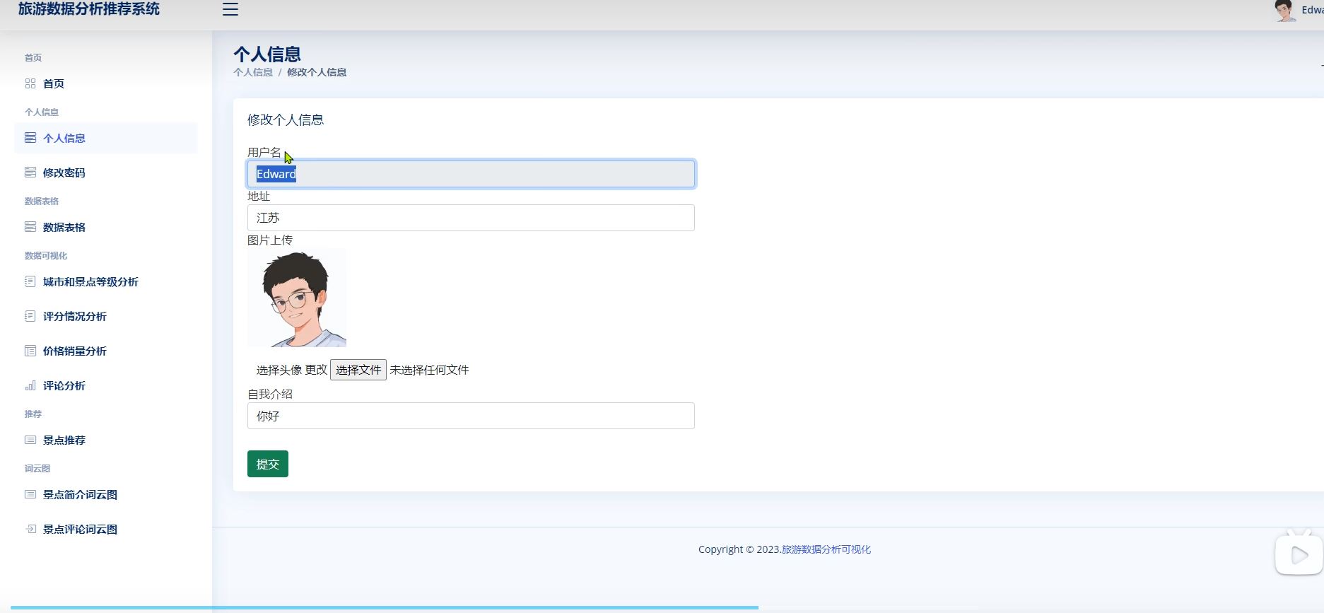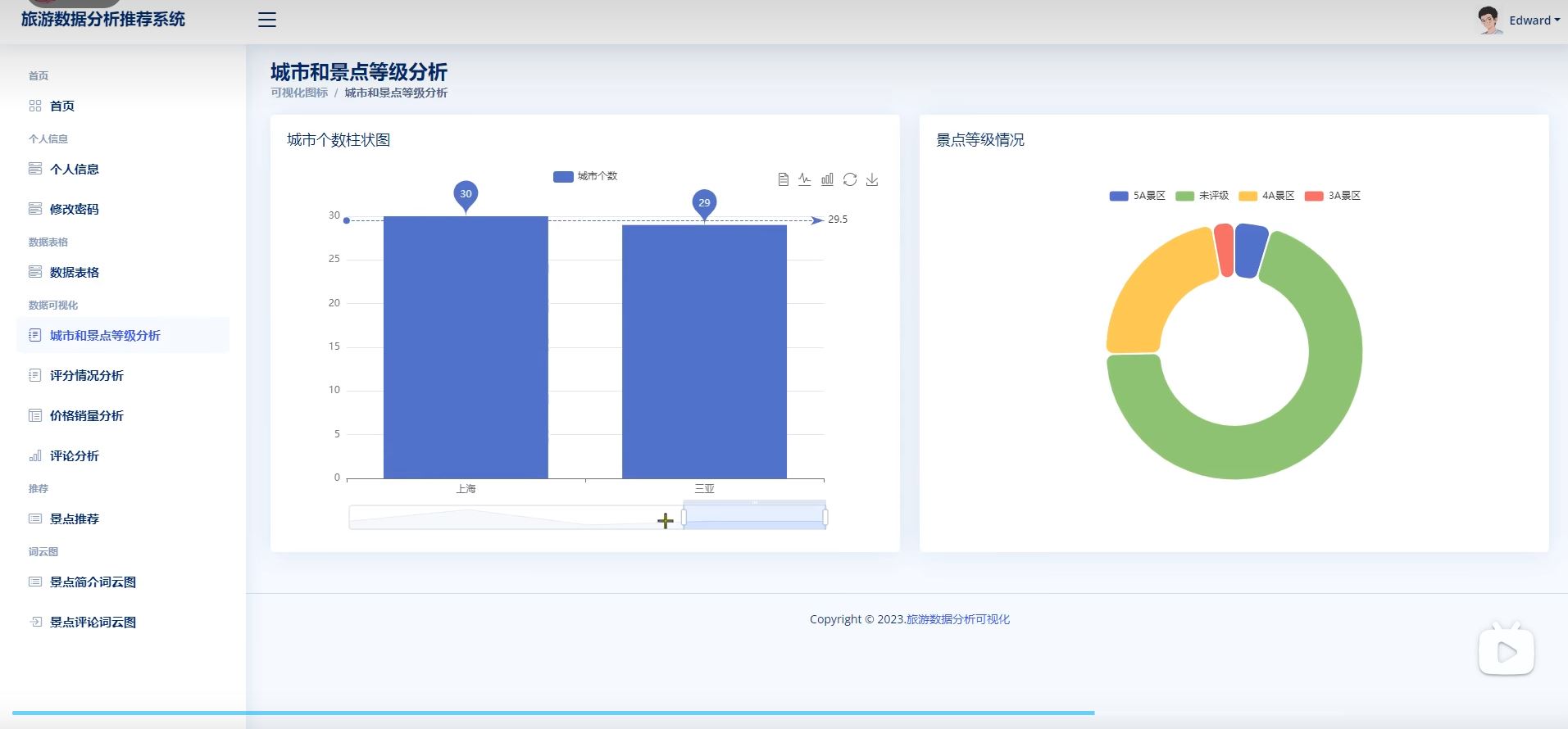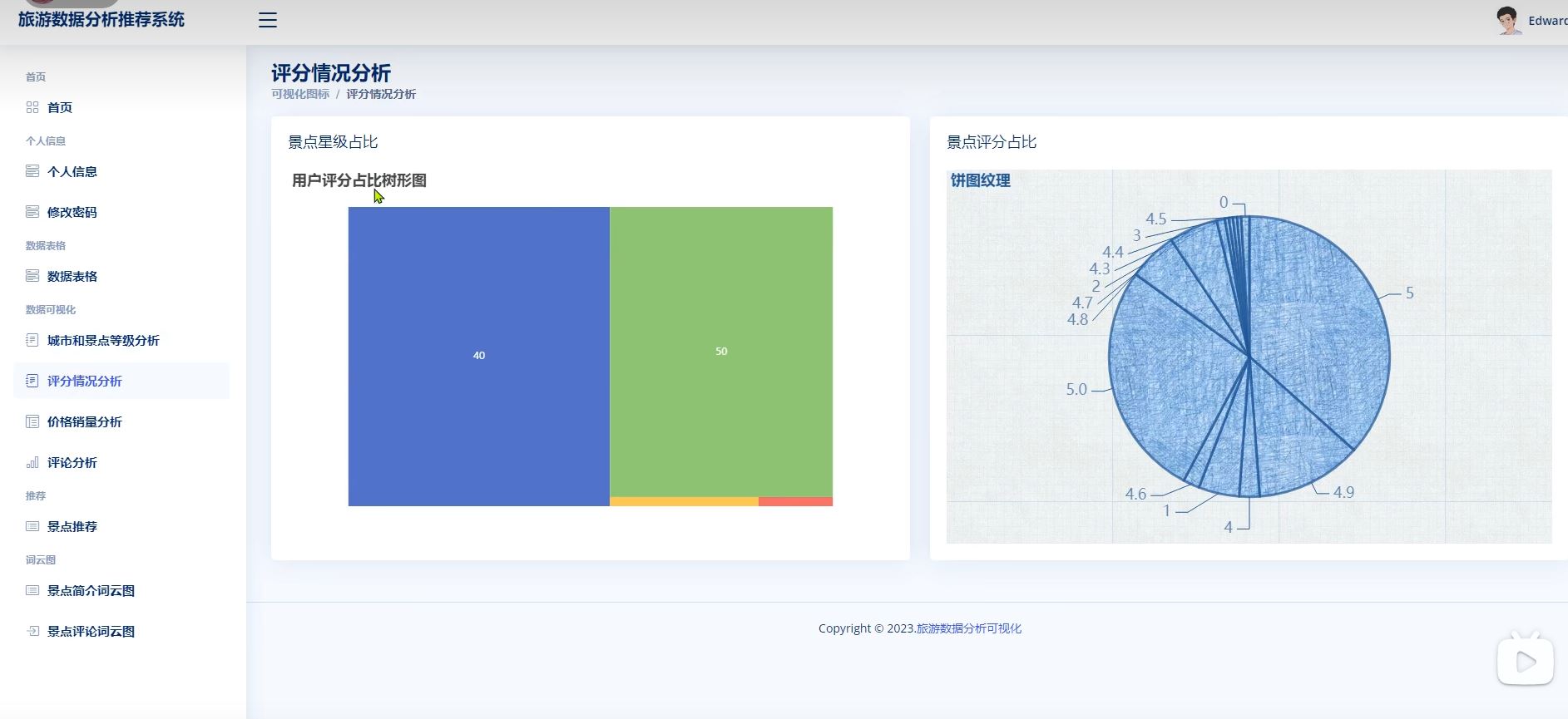 系统功能覆盖用户交互、数据管理、分析可视化与智能推荐四大核心模块,构建完整旅游信息服务闭环。用户交互模块包含登录注册、个人信息修改功能,兼顾数据安全与个性化设置;主页地区热门景区地图通过地理空间可视化技术,直观呈现不同区域热门景点分布,助力用户快速掌握区域旅游热度;数据表格模块支持景点基础信息、用户评分、评论数据的查询与管理,为数据分析提供坚实数据支撑;分析可视化模块涵盖四大核心分析维度 ------ 城市与景点等级分析(统计不同城市景点等级分布及占比)、评分情况分析(展示用户评分分布与景点评分对比)、价格销量分析(挖掘价格区间与销量的关联规律)、评论情感分析(呈现用户反馈倾向);智能推荐模块基于协同过滤算法,结合用户历史评分与偏好,实现个性化景点推送;文本可视化模块包含景点简介词云图(提炼核心特色)与评论词云图(捕捉用户关注点),助力用户快速把握景点亮点与口碑特征。整体功能设计兼顾普通用户的信息获取需求与旅游从业者的数据分析需求,达成实用性与交互性的有机统一。