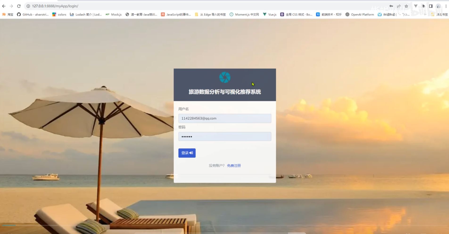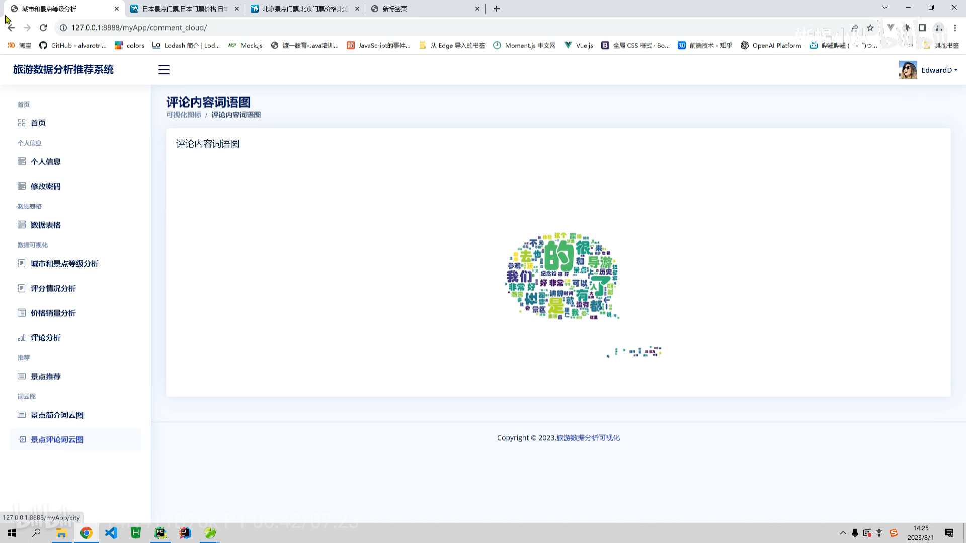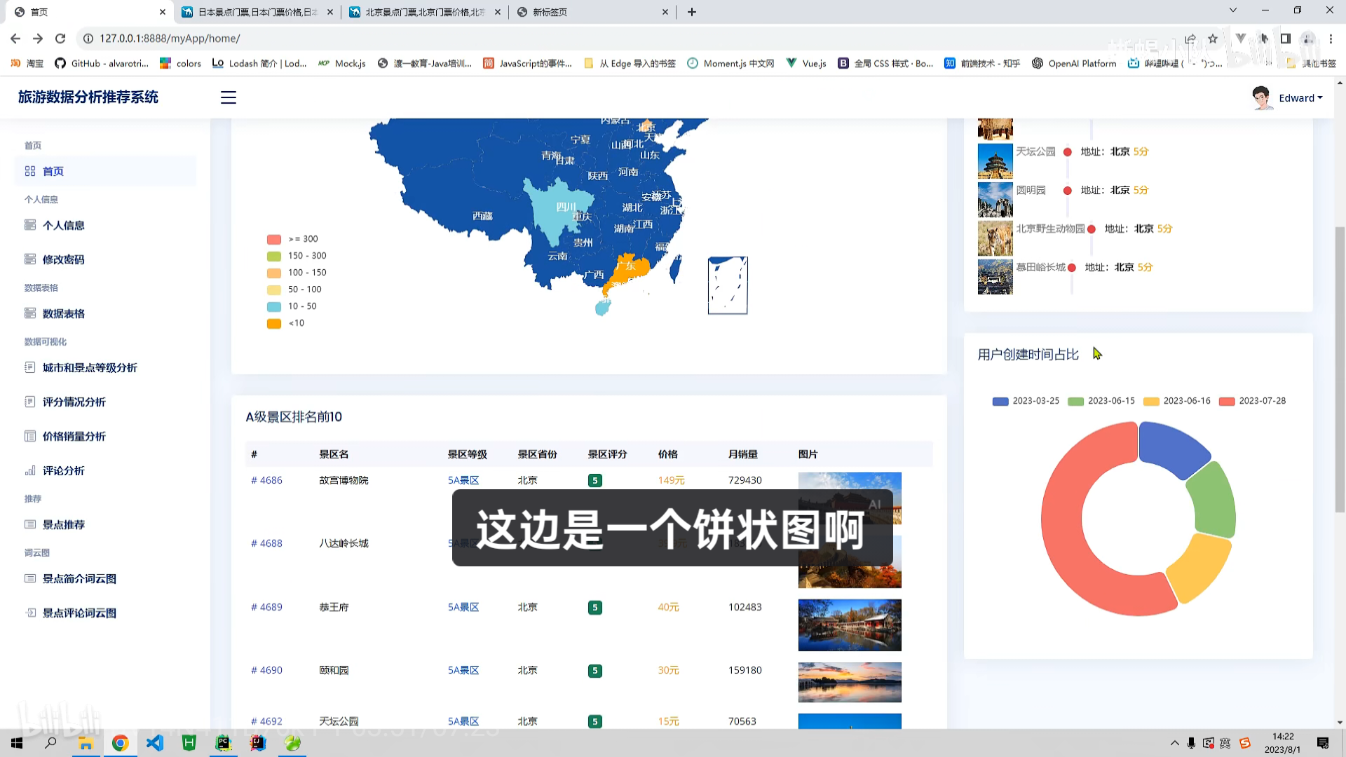 系统功能覆盖用户交互、数据管理、分析可视化与智能推荐四大核心模块,构建完整旅游信息服务闭环。用户交互模块包含登录注册、个人信息修改功能,兼顾数据安全与个性化设置;主页地区热门景区地图通过地理空间可视化技术,直观呈现不同区域热门景点分布,助力用户快速掌握区域旅游热度;数据表格模块支持景点基础信息、用户评分、评论数据的查询与管理,为数据分析提供坚实数据支撑;分析可视化模块涵盖四大核心分析维度 ------ 城市与景点等级分析(统计不同城市景点等级分布及占比)、评分情况分析(展示用户评分分布与景点评分对比)、价格销量分析(挖掘价格区间与销量的关联规律)、评论情感分析(呈现用户反馈倾向);智能推荐模块基于协同过滤算法,结合用户历史评分与偏好,实现个性化景点推送;文本可视化模块包含景点简介词云图(提炼核心特色)与评论词云图(捕捉用户关注点),助力用户快速把握景点亮点与口碑特征。整体功能设计兼顾普通用户的信息获取需求与旅游从业者的数据分析需求,达成实用性与交互性的有机统一。
