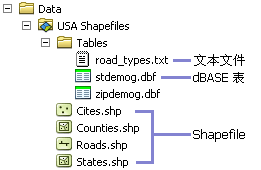 Shapefile 是一种用于存储地理要素的几何位置和属性信息的非拓扑简单格式。 shapefile 中的地理要素可表示为点、线或面(区域)。 包含 shapefile 的工作空间还可以包含 dBASE 表,它们用于存储可连接到 shapefile 的要素的附加属性。下面是 shapefile 在 ArcCatalog 中显示方式的示例。 您还可以看到 dBASE 文件(可能与 shapefile 关联)。