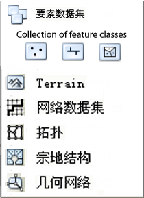 要素数据集是共用一个通用坐标系的相关要素类的集合。要素数据集用于按空间或主题整合相关要素类。它们的主要用途是,将相关要素类编排成一个公用数据集,用以构建拓扑、网络数据集、地形数据集或几何网络。