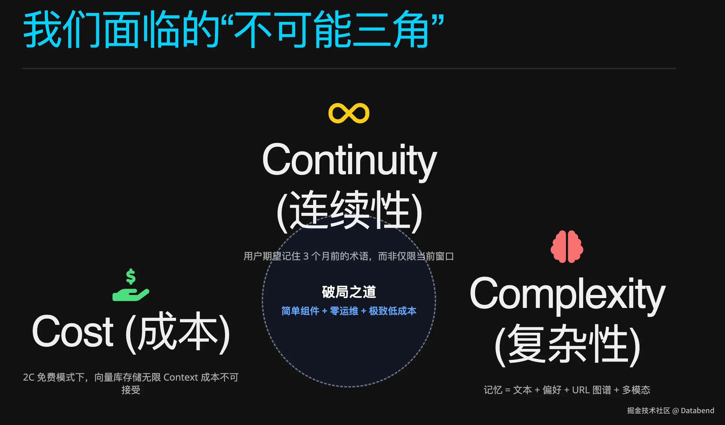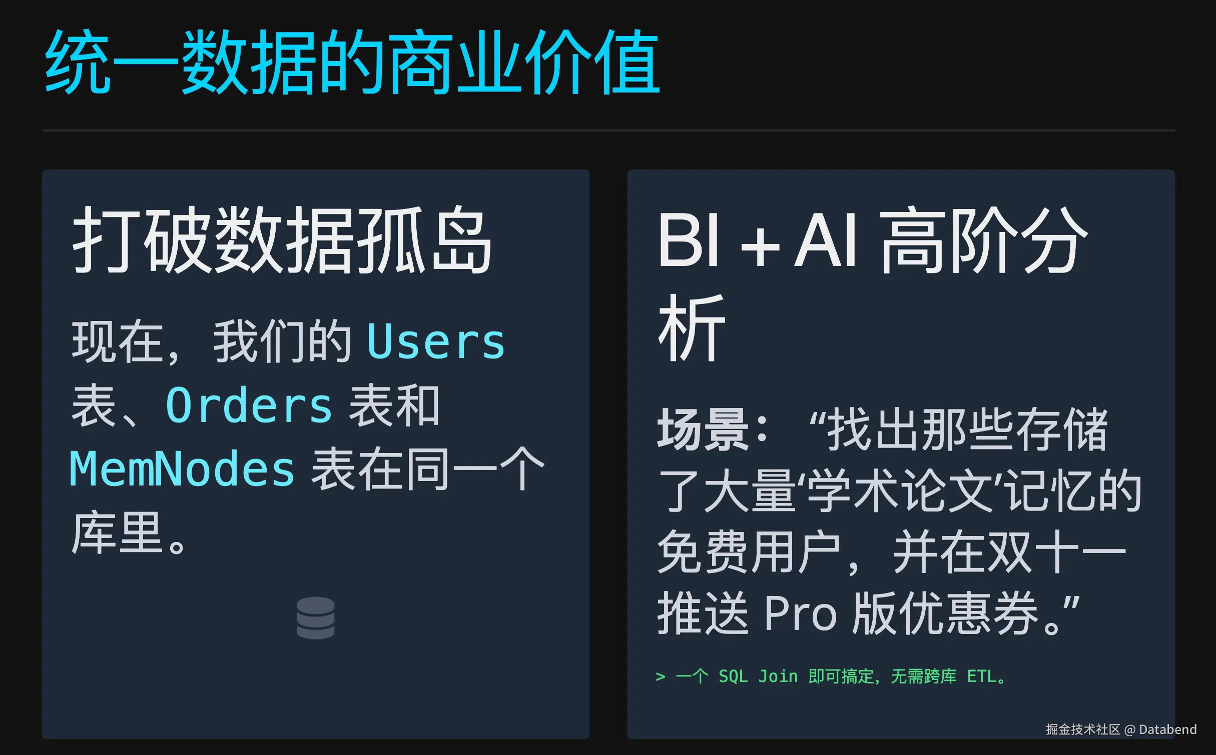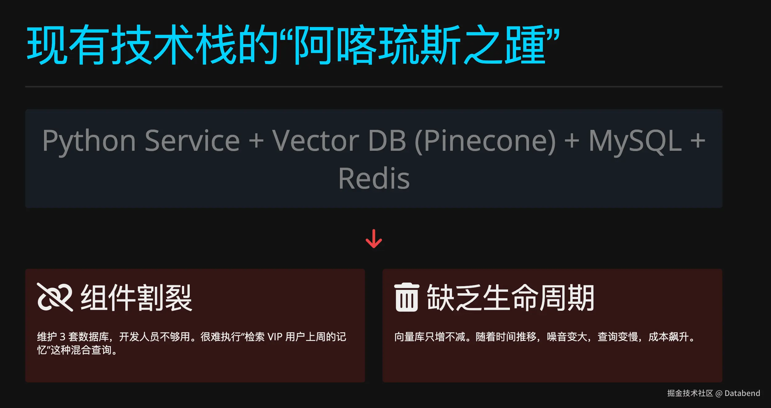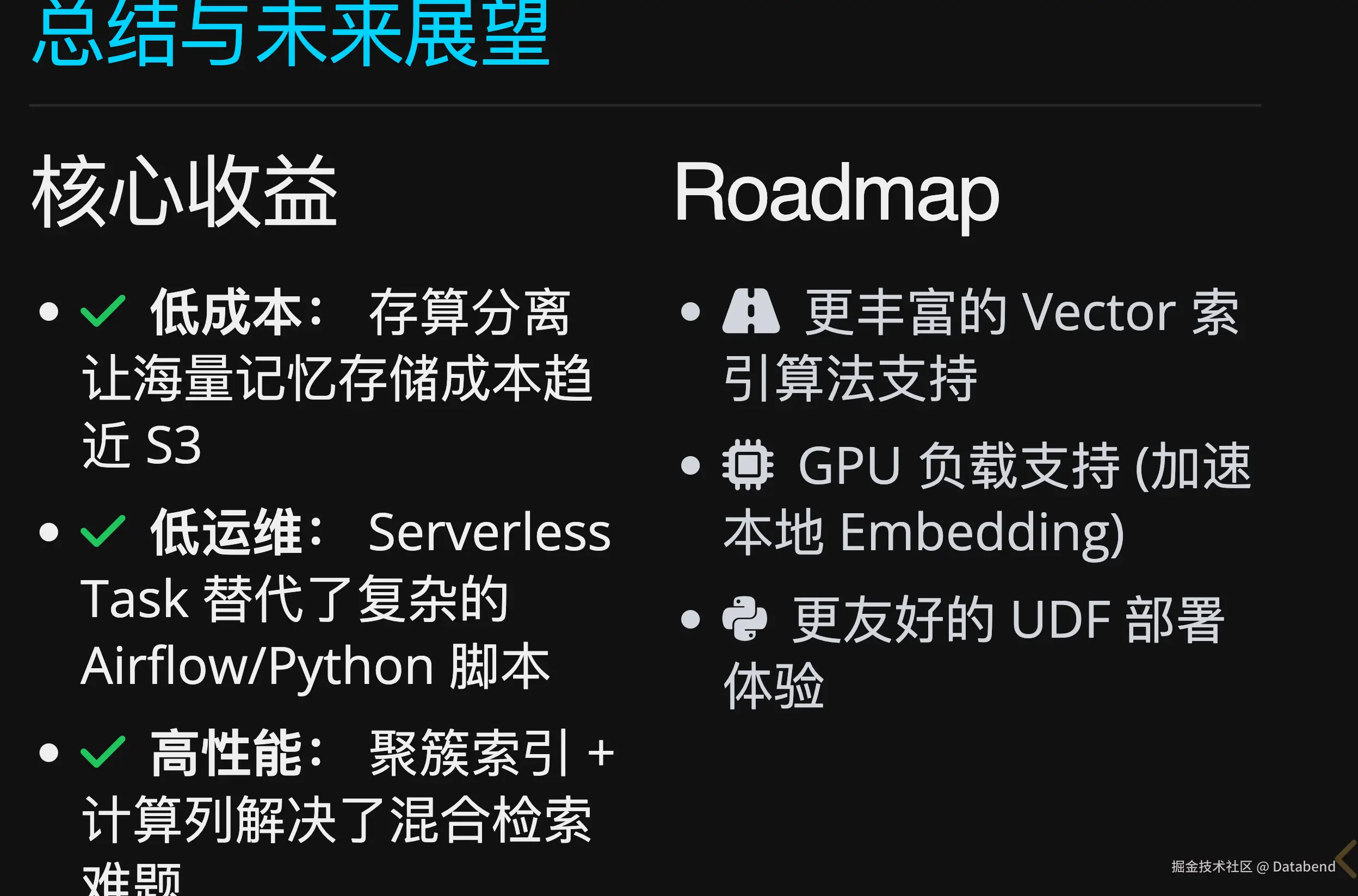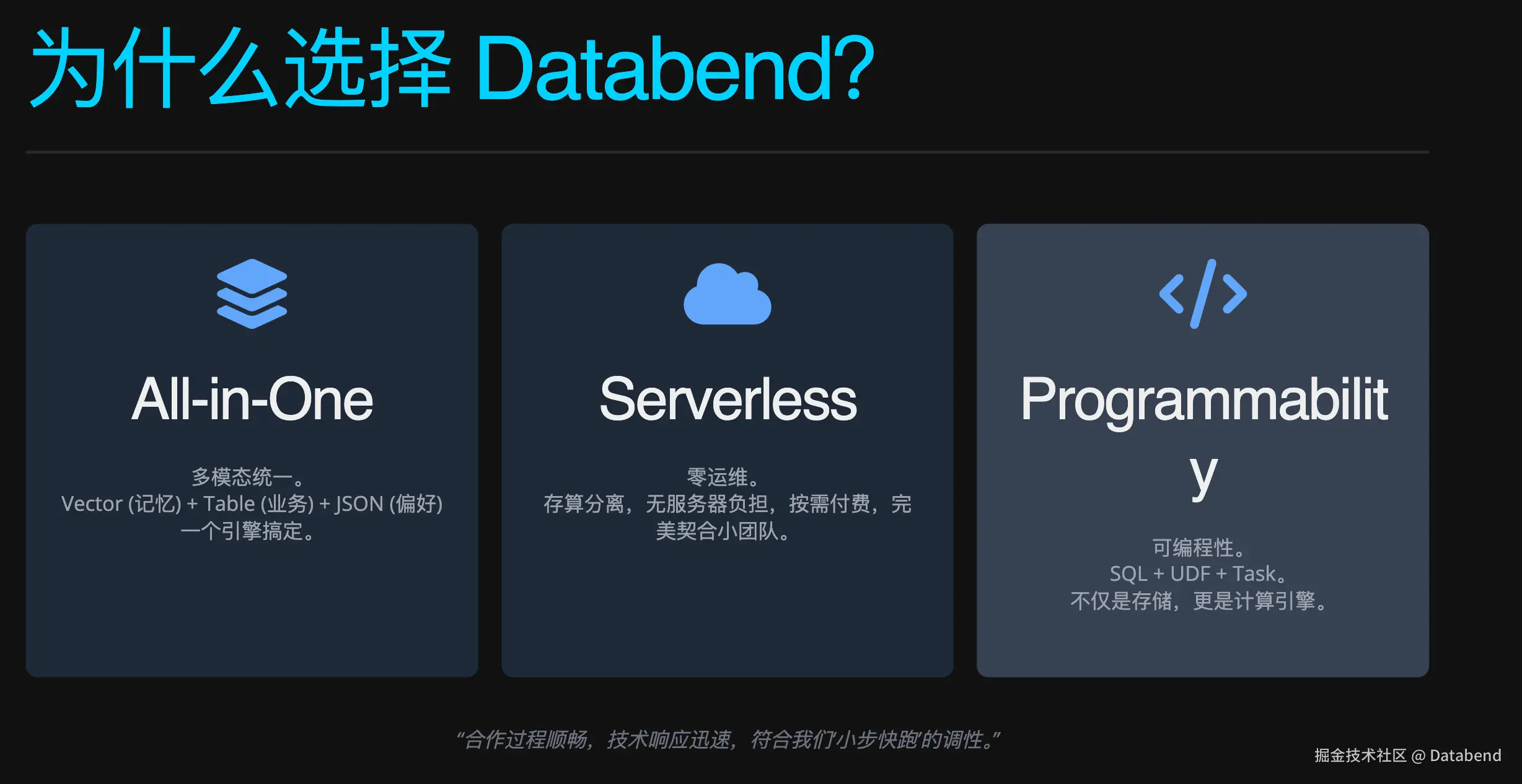 All-in-One (多模态统一) :Databend 支持 Vector(记忆)、Table(业务)和 JSON(偏好)在同一个引擎中处理,打破了数据孤岛。
