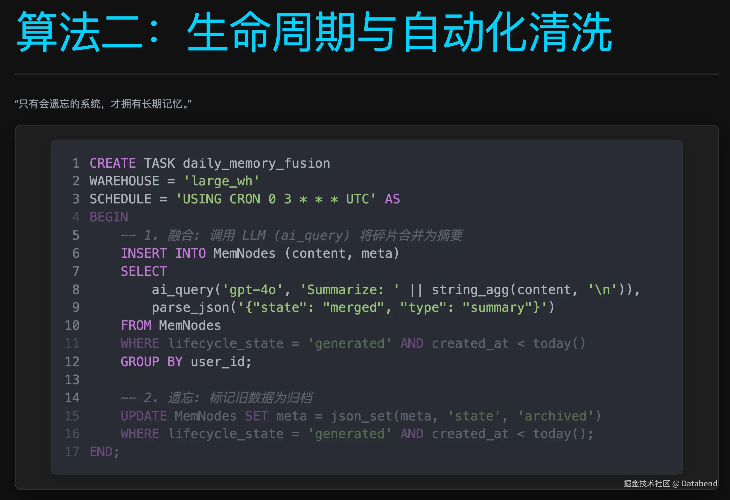 为此,他们利用 Databend 的 Task 构建了一套 Serverless ETL Pipeline。它允许开发者在数据库内部定义复杂的数据流转逻辑,将非结构化的对话流实时转化为结构化的记忆。