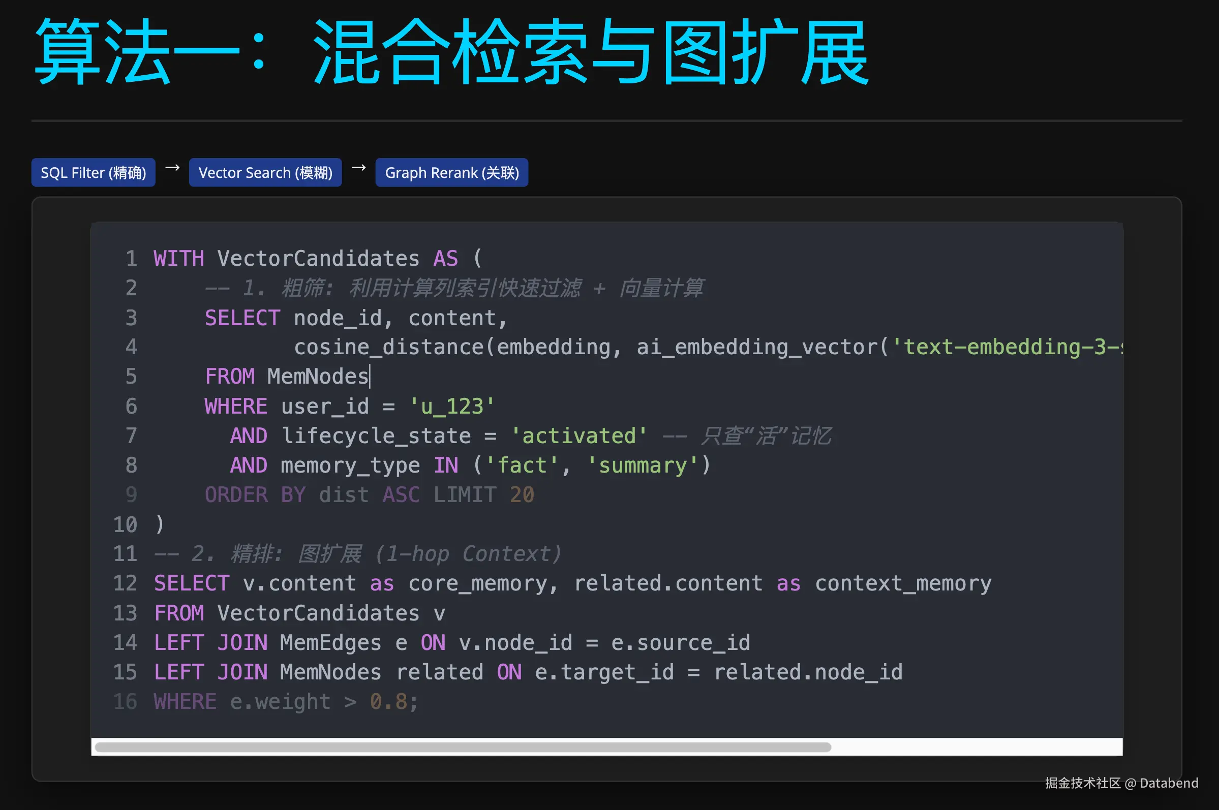 vbnetWITH HybridCandidates AS ( SELECT node_id, content, -- 向量距离:衡量语义相似度 (越小越相似) cosine_distance(embedding, :user_query_embedding) AS semantic_dist FROM MemNodes WHERE user_id = 'Bob' AND lifecycle_state = 'activated' -- 全文检索:利用倒排索引强制匹配关键词,确保精确度 AND QUERY('content:"Sourdough"') ORDER BY semantic_dist ASC LIMIT 20 ) -- 图谱扩展:拼接一跳关联 (如地点、评论) SELECT core.content AS core_memory, related.content AS context_memory, related.meta:topic AS context_topic FROM HybridCandidates core LEFT JOIN MemEdges e ON core.node_id = e.source_id LEFT JOIN MemNodes related ON e.target_id = related.node_id WHERE e.weight > 0.8;