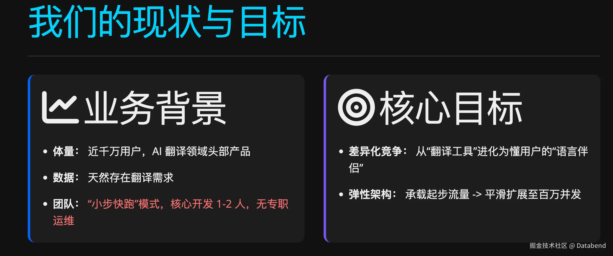 沉浸式翻译(Immersive Translate),作为 AI 翻译领域的头部产品,拥有近千万用户。在 Databend Meeup 上海站沉浸式翻译团队透露他们启起阶段是自我搭建一个HTAP库用于承接业务及数据分析,但面临运维和成本比较高的问题,特别是数据量越来越大,SSD 成本增加明显,陈琦作为开源社区的重度参与者也是早期关注到 Databend, 在和 Databend 团队沟通后,利用 Vector + Databend Task 构建数据摄入链路,整个用时3天实现从 HTAP 迁移到 Databend Cloud 上面,利用 Databend 按付费用,存算分离架构。大大降低了存储和计算成本。
