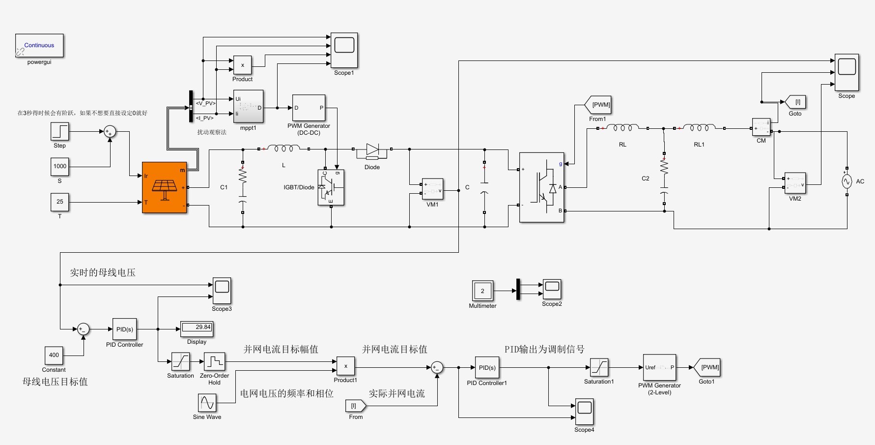 该代码通过检测光照强度的变化,利用PID调节器调整逆变器的电压,从而跟踪最大功率点。其中,Kp、Ki、Kd分别代表比例、积分和微分系数,step为电压调节步长。通过调节这些参数,可以实现对逆变器电压的精准控制。