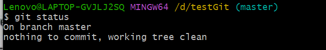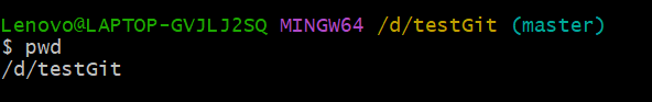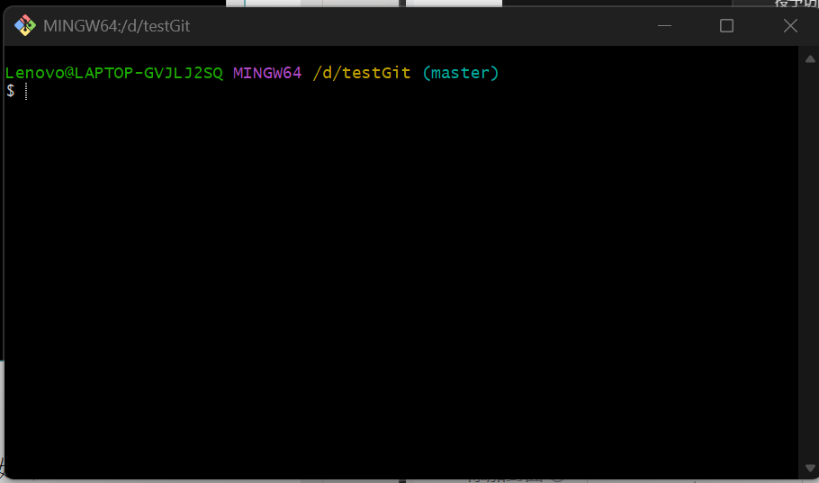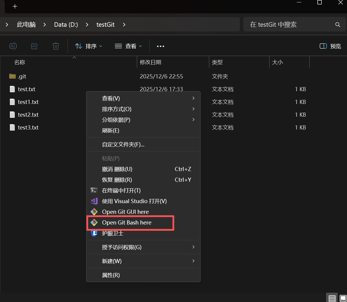 D盘目录下新建一个testGit版本库(D:\testGit)。右键通过命令行的方式打开窗口