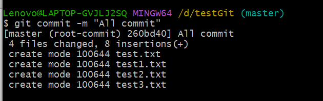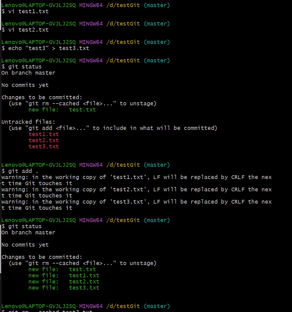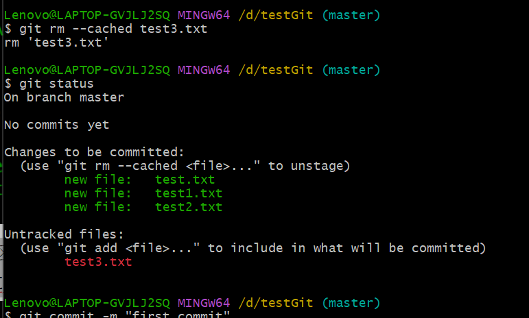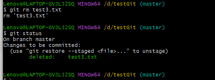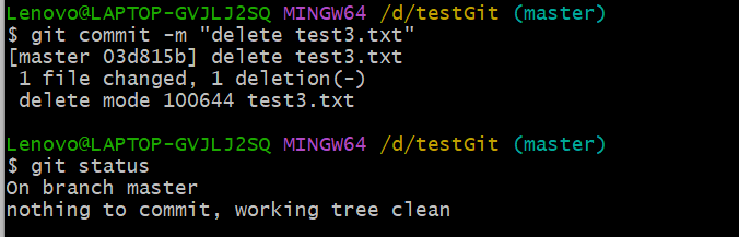 发现删除的文件直接进入暂存区(此刻需要注意,如果使用rm删除不在暂存区,需要git add才会进入暂存区。如果进入暂存区可以退回工作区,使用下面命令 git reset HEAD test3.txt),提交之后文件被删除。