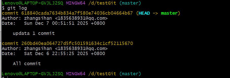 通过上面的显示我们可以知道,增加内容update 1的版本号是618840c