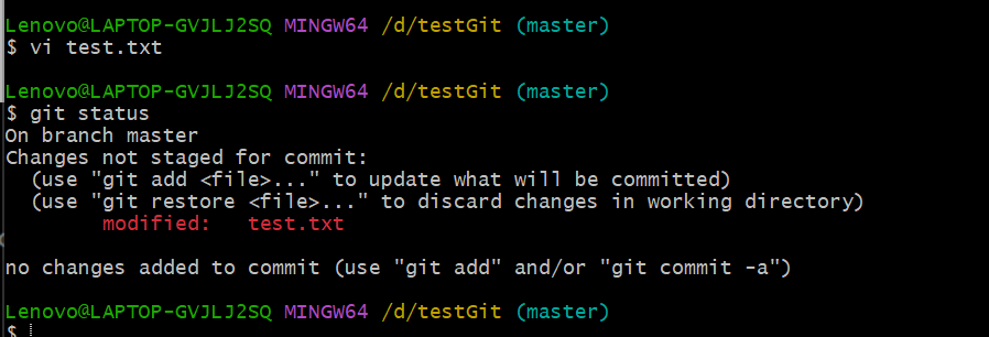 修改文件,在文件中加入一行。查看git的状态,发现文件进入到工作区