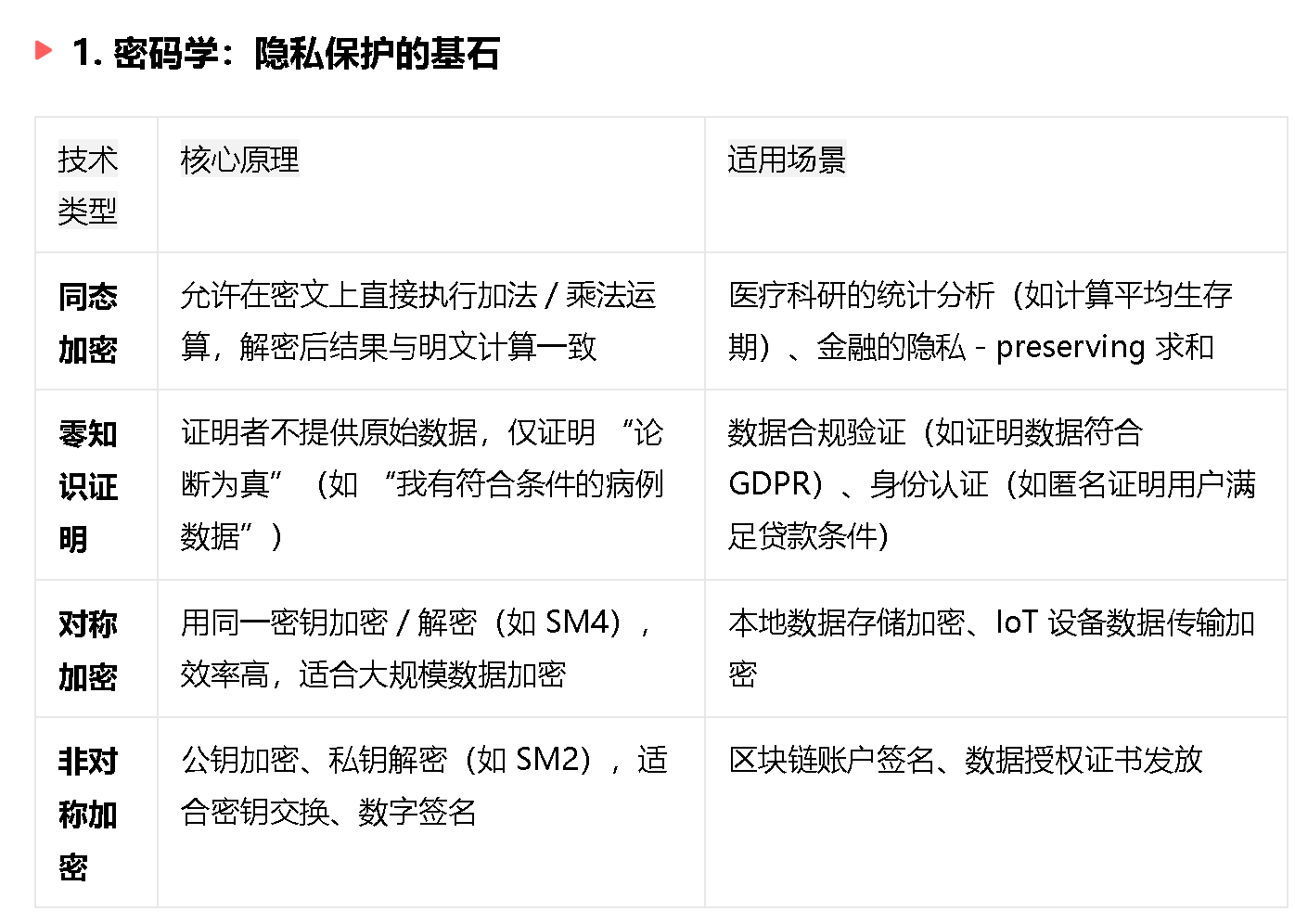 - 安全多方计算(SMPC):多方在不泄露原始数据的前提下,协同计算目标函数(如联合训练模型),适合实时性要求高的场景(金融风控);