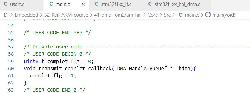 extern uint8_t dma_tranmit_complete_flg; 外部调用其他函数的成员变量使用extern