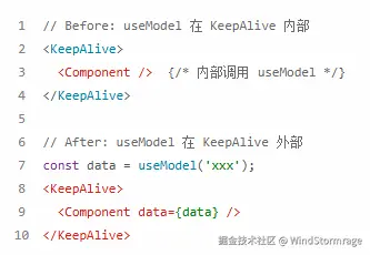 解决方案:将 useModel 调用移到 KeepAlive 外部,通过 props 向子组件传递数据: