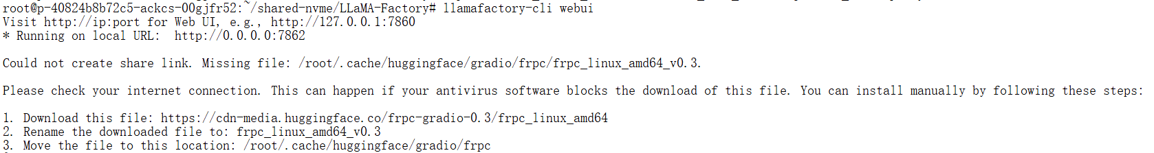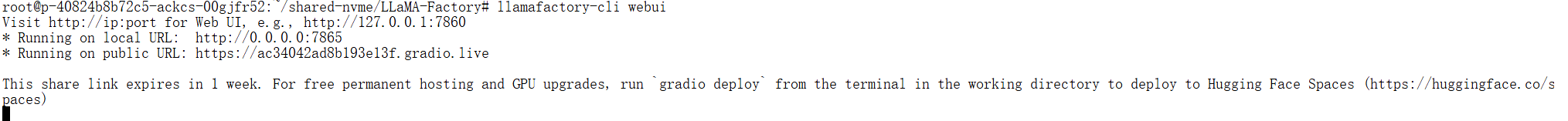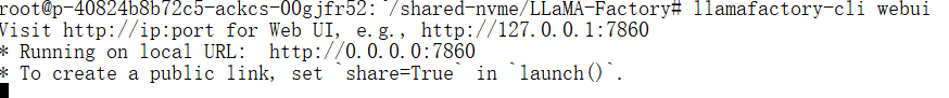 由于阿里云平台的端口映射似乎存在问题,这会导致启动LLaMA Factory的Web界面显示异常,所以需要手动在命令行运行如下命令: