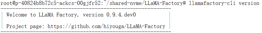 安装完毕后,输入命令 llamafactory-cli version,如下图示则安装成功!