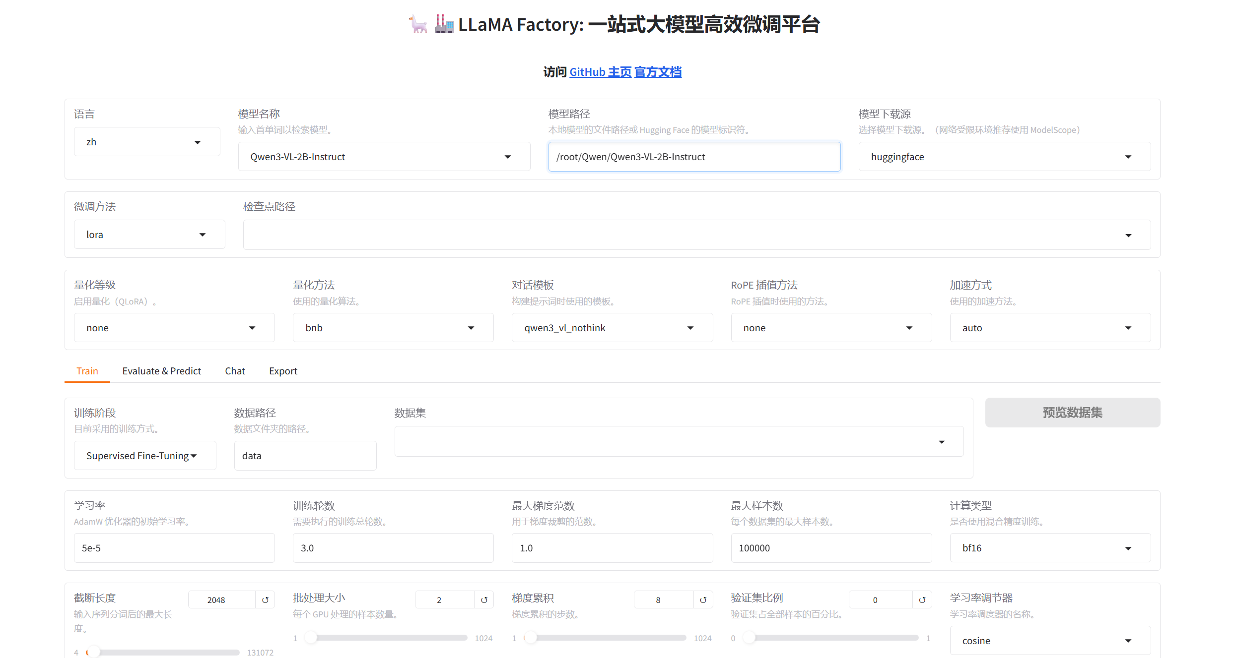 - 直接点击启动LLamaFactory之后命令行提示内容中的http://127.0.0.1:7860 会打开新开一个页面,打开类似