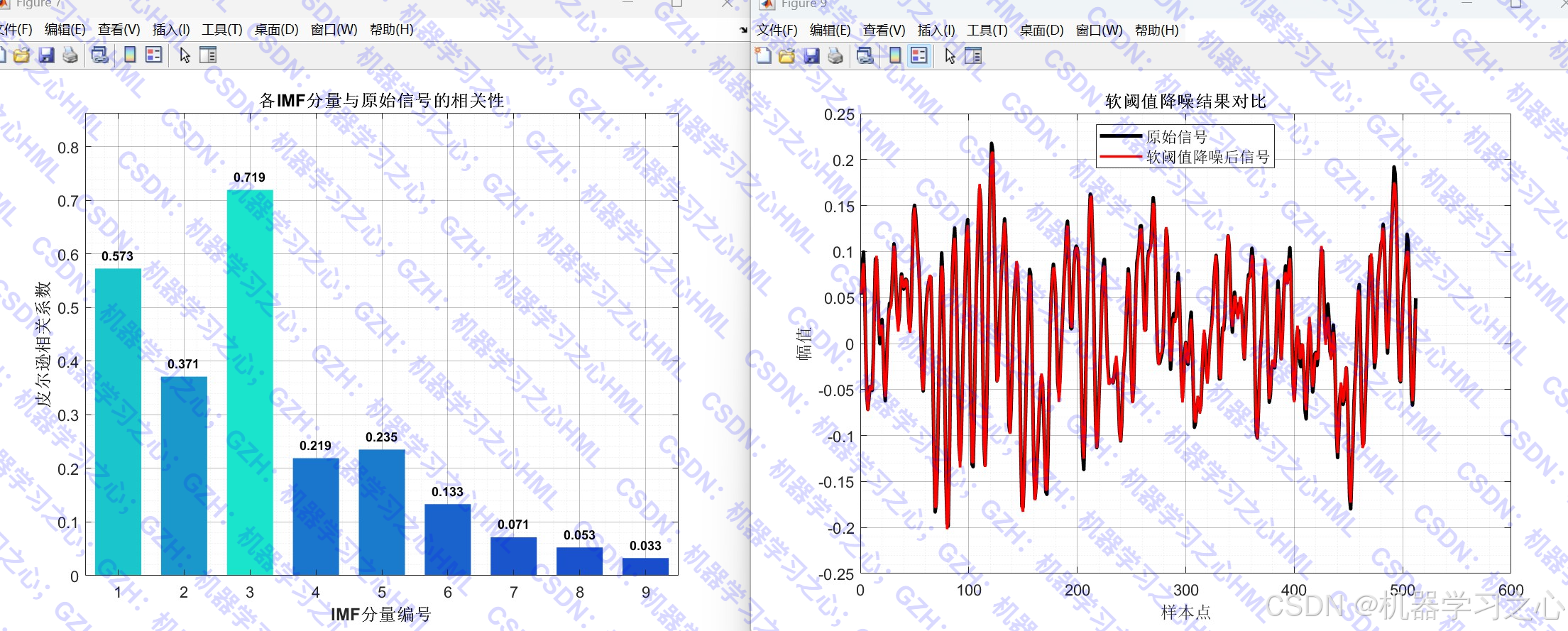 - 信号降噪:基于IMF分量与原始信号的相关系数,筛选噪声分量并进行小波阈值降噪(软/硬阈值)。