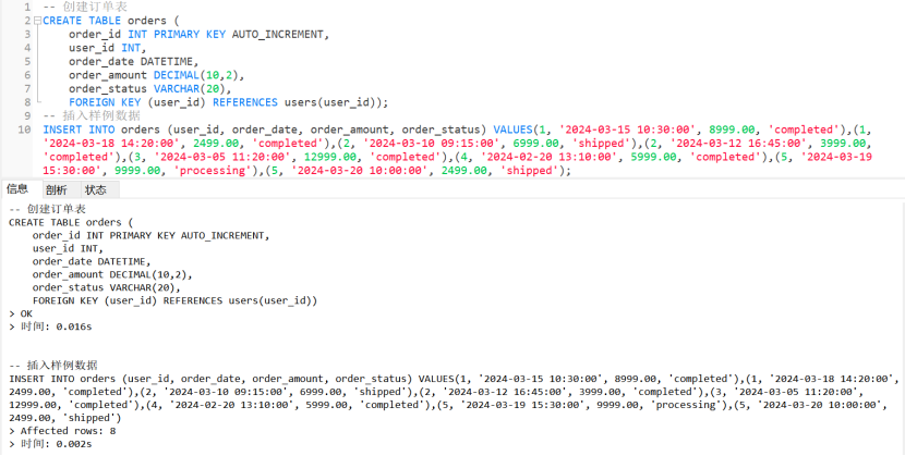 INSERT INTO orders (user_id, order_date, order_amount, order_status) VALUES(1, '2024-03-15 10:30:00', 8999.00, 'completed'),(1, '2024-03-18 14:20:00', 2499.00, 'completed'),(2, '2024-03-10 09:15:00', 6999.00, 'shipped'),(2, '2024-03-12 16:45:00', 3999.00, 'completed'),(3, '2024-03-05 11:20:00', 12999.00, 'completed'),(4, '2024-02-20 13:10:00', 5999.00, 'completed'),(5, '2024-03-19 15:30:00', 9999.00, 'processing'),(5, '2024-03-20 10:00:00', 2499.00, 'shipped');