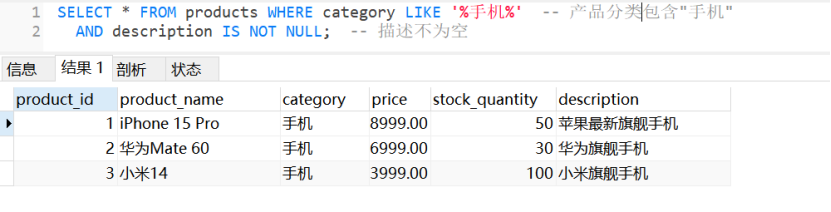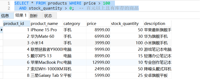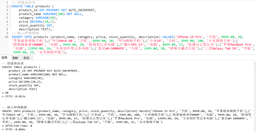 INSERT INTO products (product_name, category, price, stock_quantity, description) VALUES('iPhone 15 Pro', '手机', 8999.00, 50, '苹果最新旗舰手机'),('华为Mate 60', '手机', 6999.00, 30, '华为旗舰手机'),('小米14', '手机', 3999.00, 100, '小米旗舰手机'),('联想拯救者Y9000P', '电脑', 9999.00, 20, '游戏笔记本电脑'),('戴尔XPS 13', '电脑', 8999.00, 15, '轻薄办公笔记本'),('苹果MacBook Pro', '电脑', 12999.00, 10, '专业创作笔记本电脑'),('索尼WH-1000XM5', '耳机', 2499.00, 50, '降噪头戴式耳机'),('三星Galaxy Tab S9', '平板', 5999.00, 25, '安卓旗舰平板');