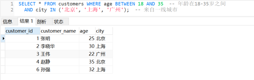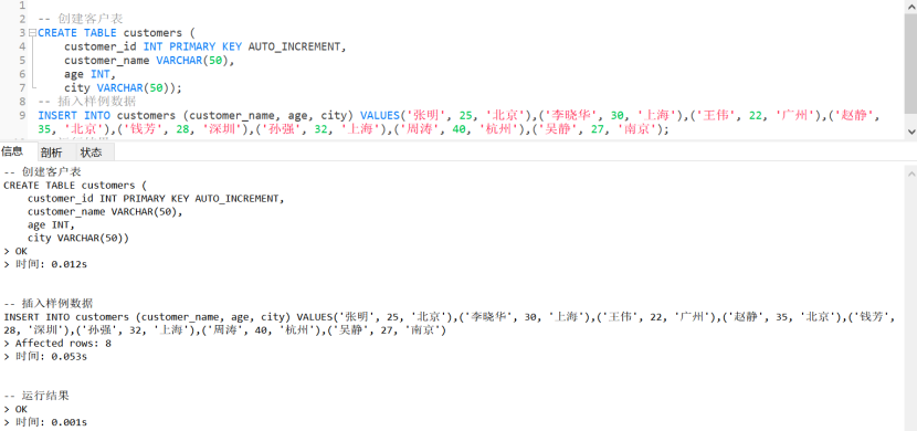 INSERT INTO customers (customer_name, age, city) VALUES('张明', 25, '北京'),('李晓华', 30, '上海'),('王伟', 22, '广州'),('赵静', 35, '北京'),('钱芳', 28, '深圳'),('孙强', 32, '上海'),('周涛', 40, '杭州'),('吴静', 27, '南京');