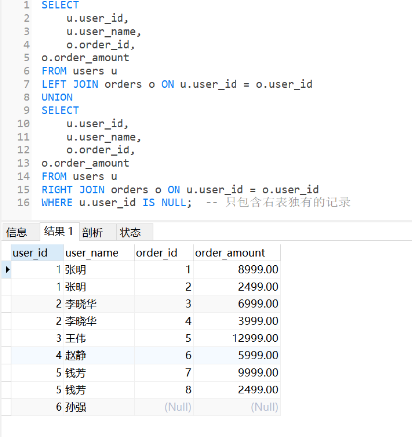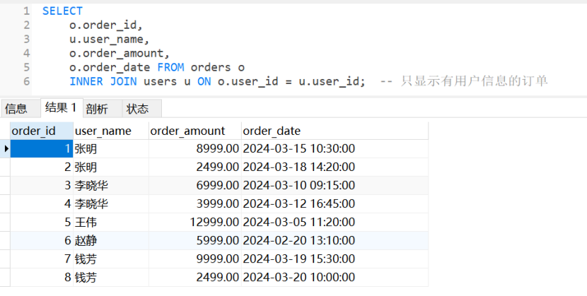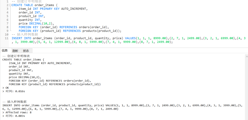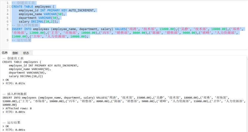在开始学习SQL之前,我们需要创建一个练习环境。以下是完整的建表语句和样例数据,你可以在MySQL 8.0中直接运行这些代码。