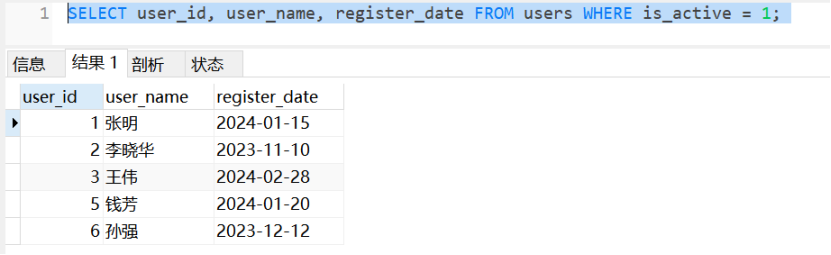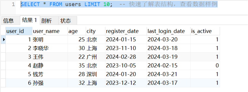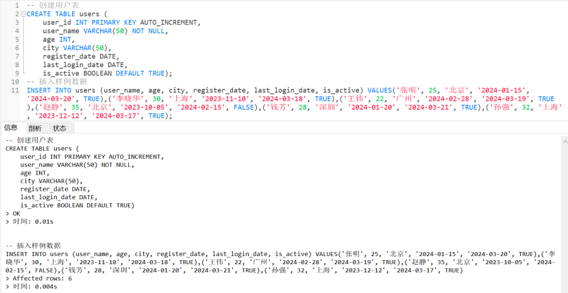 INSERT INTO users (user_name, age, city, register_date, last_login_date, is_active) VALUES('张明', 25, '北京', '2024-01-15', '2024-03-20', TRUE),('李晓华', 30, '上海', '2023-11-10', '2024-03-18', TRUE),('王伟', 22, '广州', '2024-02-28', '2024-03-19', TRUE),('赵静', 35, '北京', '2023-10-05', '2024-02-15', FALSE),('钱芳', 28, '深圳', '2024-01-20', '2024-03-21', TRUE),('孙强', 32, '上海', '2023-12-12', '2024-03-17', TRUE);