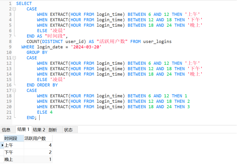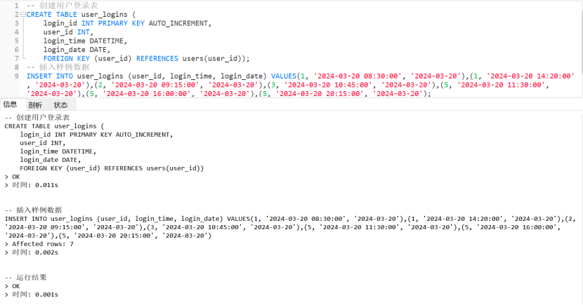 INSERT INTO user_logins (user_id, login_time, login_date) VALUES(1, '2024-03-20 08:30:00', '2024-03-20'),(1, '2024-03-20 14:20:00', '2024-03-20'),(2, '2024-03-20 09:15:00', '2024-03-20'),(3, '2024-03-20 10:45:00', '2024-03-20'),(5, '2024-03-20 11:30:00', '2024-03-20'),(5, '2024-03-20 16:00:00', '2024-03-20'),(5, '2024-03-20 20:15:00', '2024-03-20');
