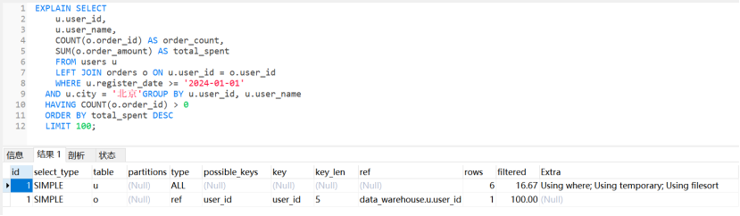 | 临时表 | Extra含Using temporary | 优化GROUP BY或JOIN条件 |