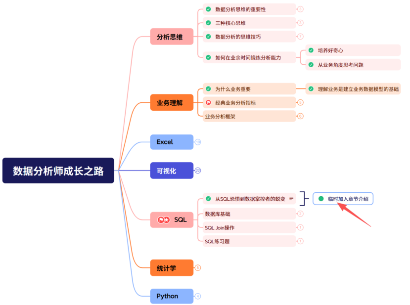 现在,当你已经掌握了SQL这个强大的工具,我们可以更从容地回到数据分析师的完整成长路径上来: