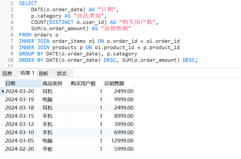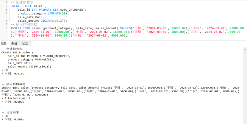 INSERT INTO sales (product_category, sale_date, sales_amount) VALUES('手机', '2024-03-01', 15000.00),('手机', '2024-03-02', 22000.00),('电脑', '2024-03-01', 12000.00),('电脑', '2024-03-02', 18000.00),('耳机', '2024-03-01', 5000.00),('耳机', '2024-03-02', 7500.00),('平板', '2024-03-01', 8000.00),('平板', '2024-03-02', 6000.00);