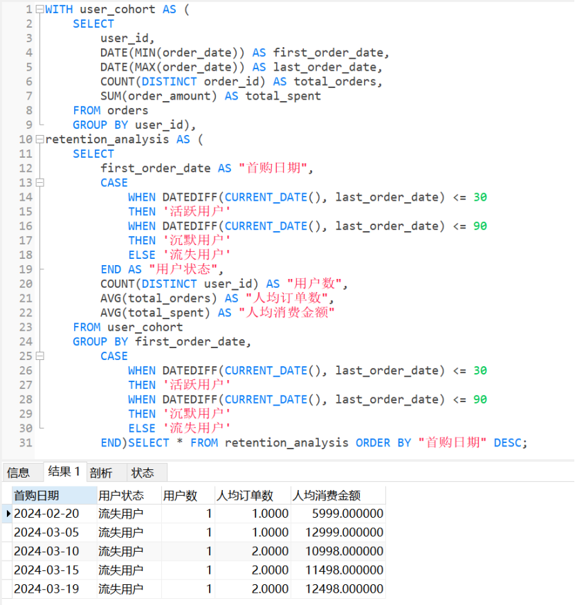 - ****结构化思考:****FROM → WHERE → GROUP BY → SELECT的顺序就是分析逻辑