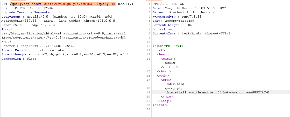 /usr/bin/whois明显是Linux系统,可以用换行符,达到执行两条命令的效果,