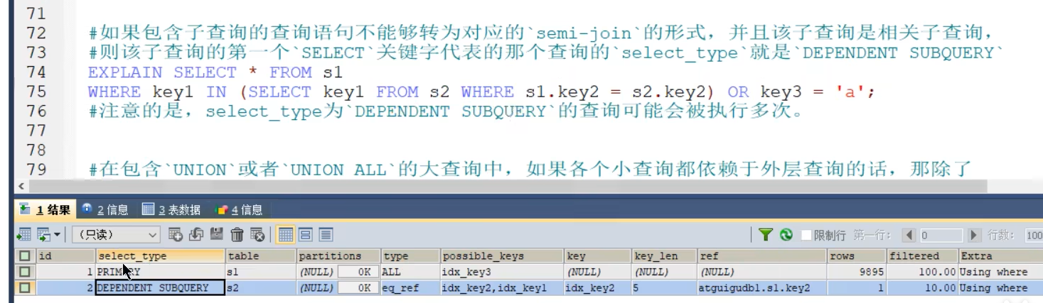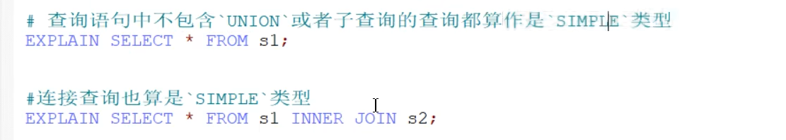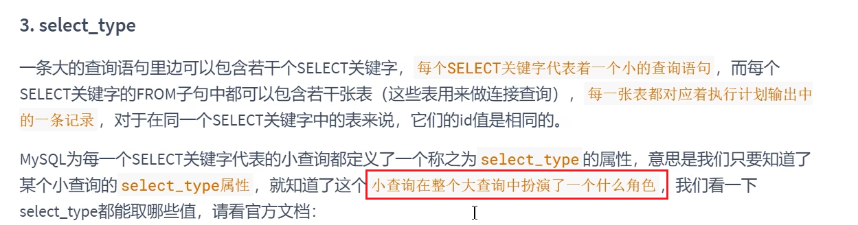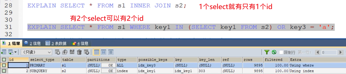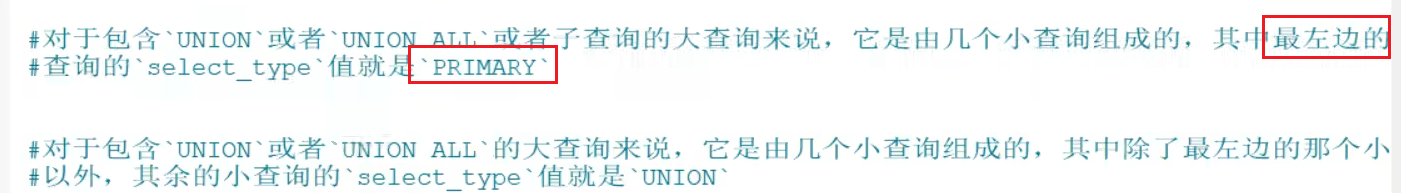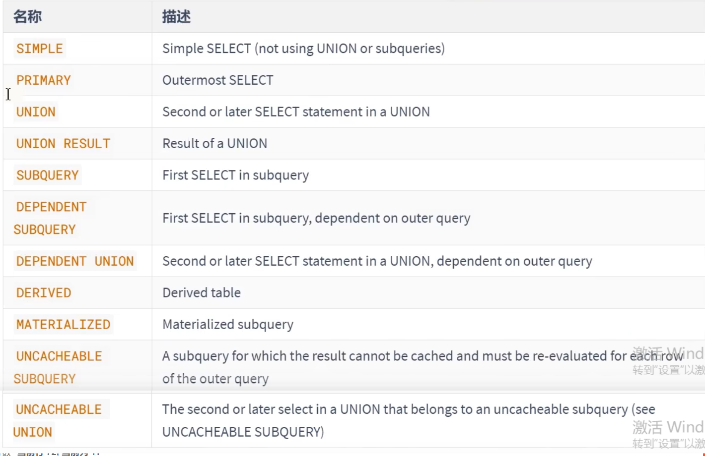 - 在外层的是PRIMARY,在内层的子查询是SUBQUERY