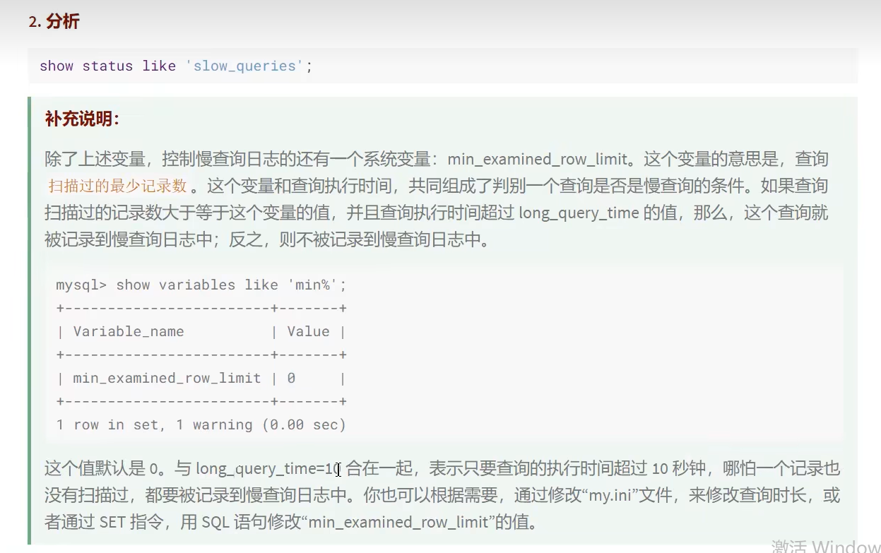 - 查询次数min_examined_row_limit,如果设置为3,就是3次超过设置的long_query_time阈值,就记录到慢查询日志中,而不是某一次偶发性超过阈值。
